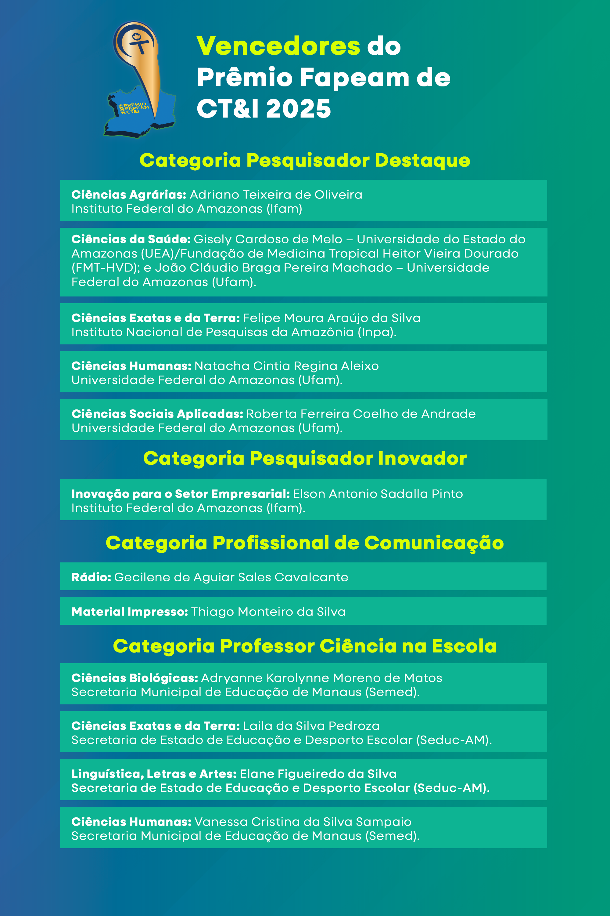Ao todo, 13 vencedores foram premiados nas categorias Pesquisador Destaque, Pesquisador Inovador, Profissional de Comunicação e Professor Ciência na Escola (PCE), contemplando diversas áreas do conhecimento. De acordo com a reitora da Ufam, professora Tanara Lauschner, é com alegria e orgulho que a Ufam celebra os feitos dos docentes e pesquisadores que tiveram suas trajetórias acadêmicas e científicas reconhecidas no Prêmio Fapeam de Ciência, Tecnologia e Inovação – Edição 2025, uma iniciativa relevante de fomento e valorização da produção científica no Estado do Amazonas.