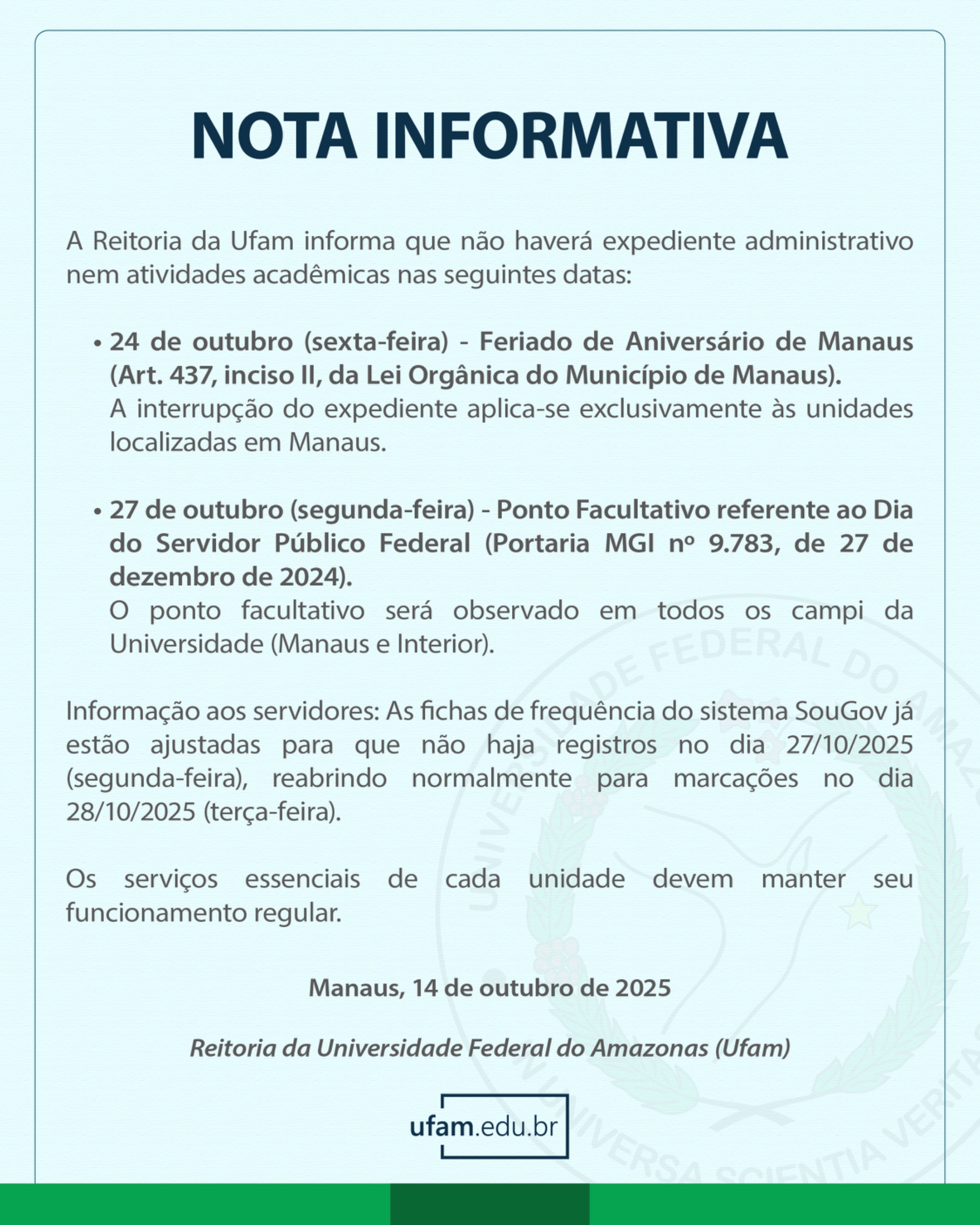 Nota Informaiva - Expediente administrativo e atividades acadêmicas nos dias 24 e 27 de outubro