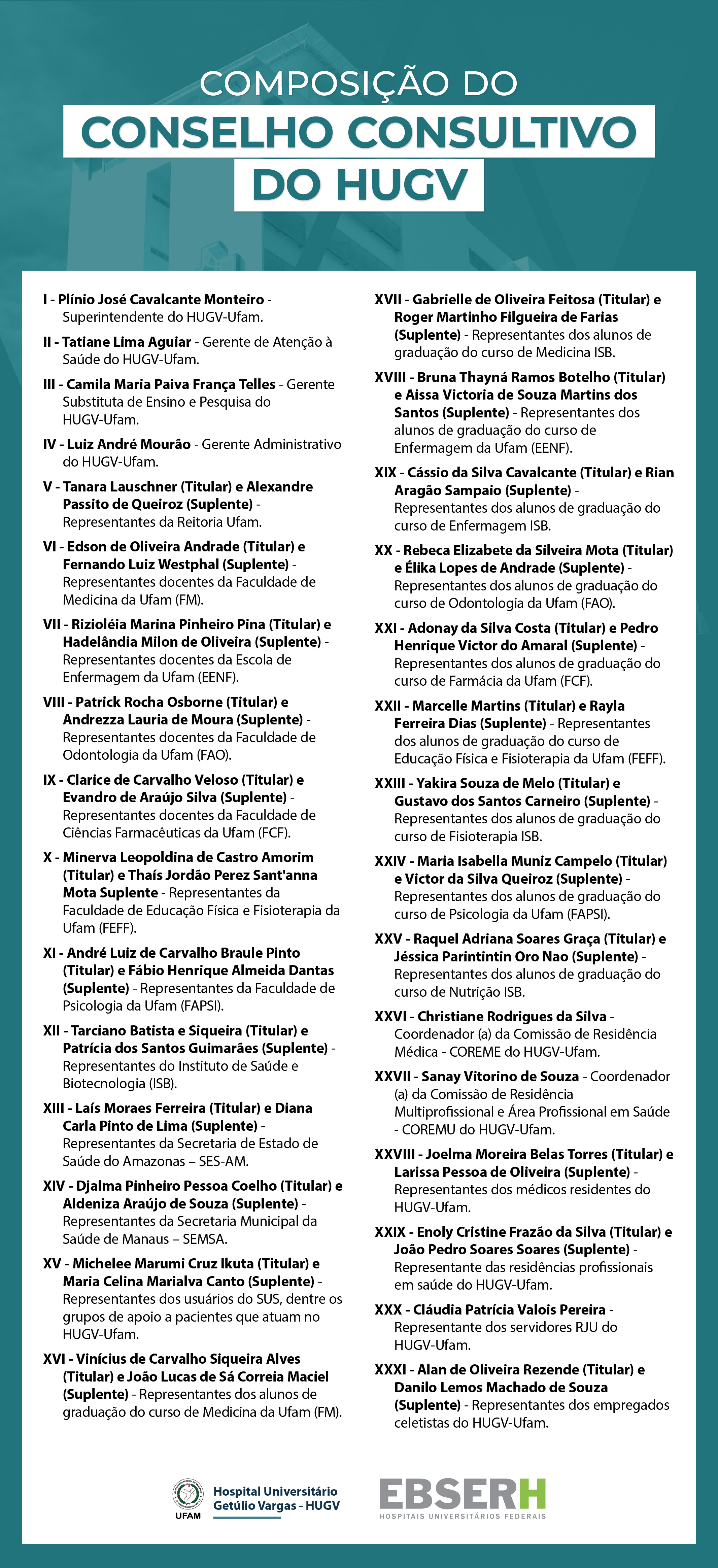 O Conselho Consultivo do HUGV-UFAM é um colegiado permanente de assessoramento ligado à Superintendência. Sua finalidade é orientar a atuação da Superintendência e do Colegiado Executivo, bem como avaliar e fazer sugestões sobre o planejamento estratégico e as ações do hospital. O funcionamento do Conselho é regulamentado por Regimento Interno próprio, pelas normas internas do HUGV-Ufam, além das normativas da Ebserh e legislações vigentes.