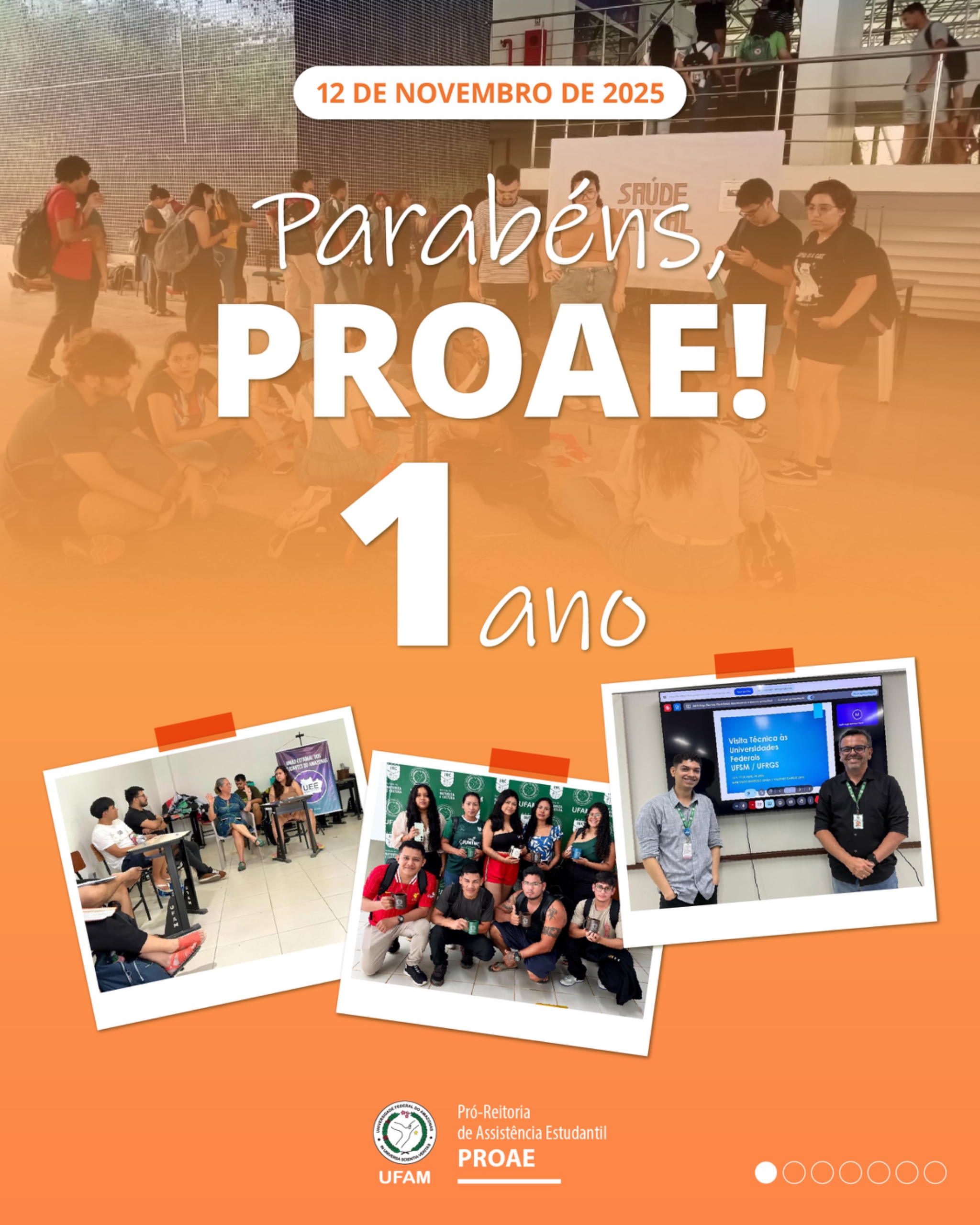 A mais jovem Pró-Reitoria da Universidade Federal do Amazonas (Ufam) completa seu primeiro aniversário com muito o que comemorar. Originada do antigo Departamento de Assistência Estudantil da Pró-Reitoria de Gestão de Pessoas (Progesp), a Pró-Reitoria de Assistência Estudantil (Proae) foi criada em 12 de novembro de 2024 e, desde então, vem ampliando seu leque de atuação em benefício do público discente. Seu propósito é fortalecer os eixos de acesso e permanência ao concretizar a Política Nacional de Assistência Estudantil (Pnaes) considerando as especificidades regionais e locais.