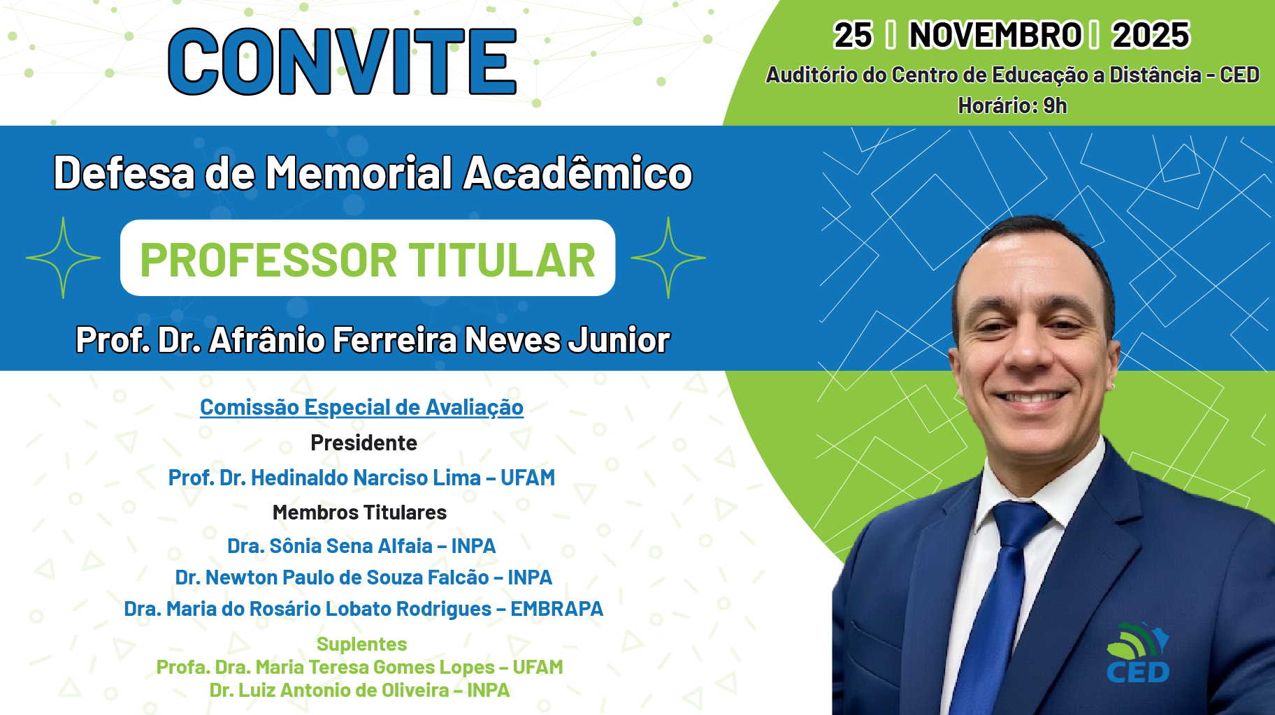 Na apreciação da defesa do memorial acadêmico que possibilita a ascensão ao último nível da carreira do magistério superior, o professor Afrânio Neves é avaliado pela Comissão Especial de Avaliação para Professor Titular instituída pela Portaria GR n. 2.541/2025, formada pelos seguintes membros: professor Hedinaldo Narciso Lima, da FCA/Ufam, como presidente; professora Sônia Sena Alfaia, do Instituto Nacional de Pesquisas da Amazônia (Inpa); professor Newton Paulo de Souza Falcão, do Inpa; e professora Maria do Rosário Lobato Rodrigues, da Empresa Brasileira de Pesquisa Agropecuária (Embrapa) Amazônia Ocidental. Como suplentes, a professora Maria Teresa Gomes Lopes (Ufam); e o professor Luiz Antônio de Oliveira (Inpa).