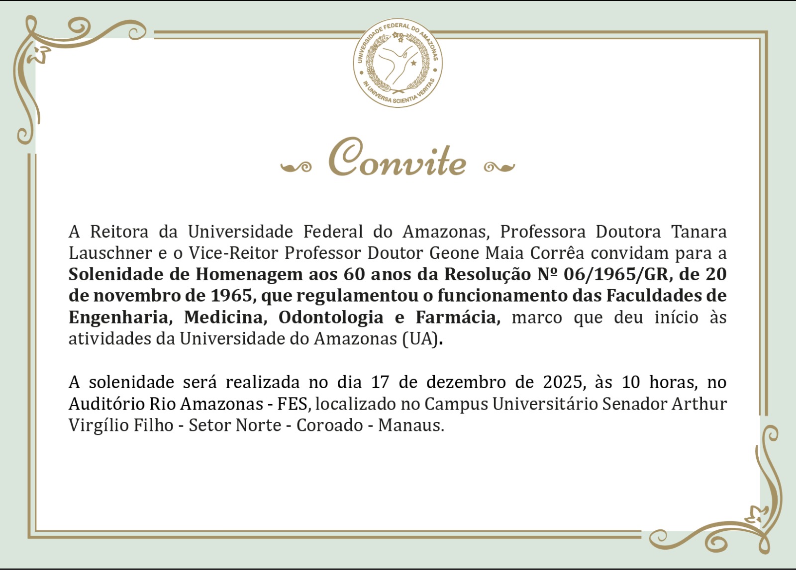 A Universidade Federal do Amazonas (Ufam) convida a comunidade acadêmica para a comemoração dos 60 anos de instituição da Universidade do Amazonas (UA), instituída pelo Conselho Universitário por meio da Resolução n. 06/1965, de 20 de novembro. A solenidade será no dia 17 de dezembro, às 10h, no auditório Rio Amazonas, localizado na Faculdade de Estudos Sociais (FES), Setor Norte do Campus Sede.