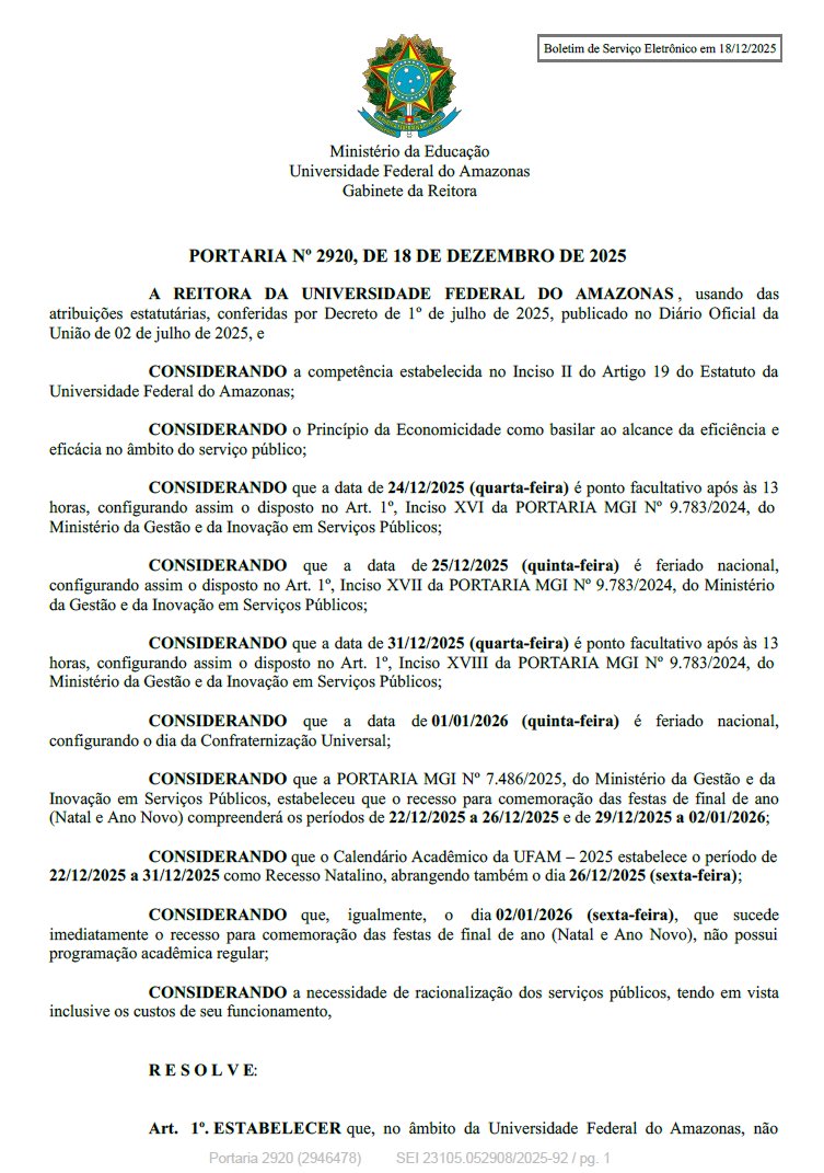 A Administração Superior da Universidade Federal do Amazonas (Ufam) informa, por meio da Portaria n. 2.920, de 18 de dezembro de 2025, acerca do expediente geral e regular de 22 a 26 de dezembro de 2025, a Semana do Natal, e de 29 de dezembro de 2025 a 02 de janeiro de 2026, a Semana do Ano Novo.