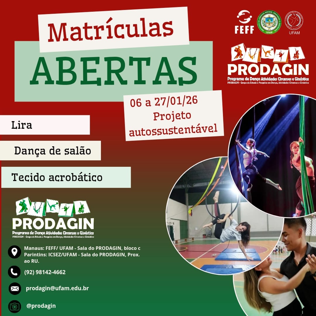 O Programa de Dança, Atividades Circenses e Ginástica (Prodagin), atividade de extensão da Universidade Federal do Amazonas (Ufam), oferta vagas para diversos cursos a serem realizados na Faculdade de Educação Física e Fisioterapia (Feff), no campus Sede, em Manaus, ou no Instituto de Ciências Sociais, Educação e Zootecnia (ICSEZ). Há oportunidades em cursos gratuitos ou autossustentáveis, estes últimos com cobrança de mensalidade.