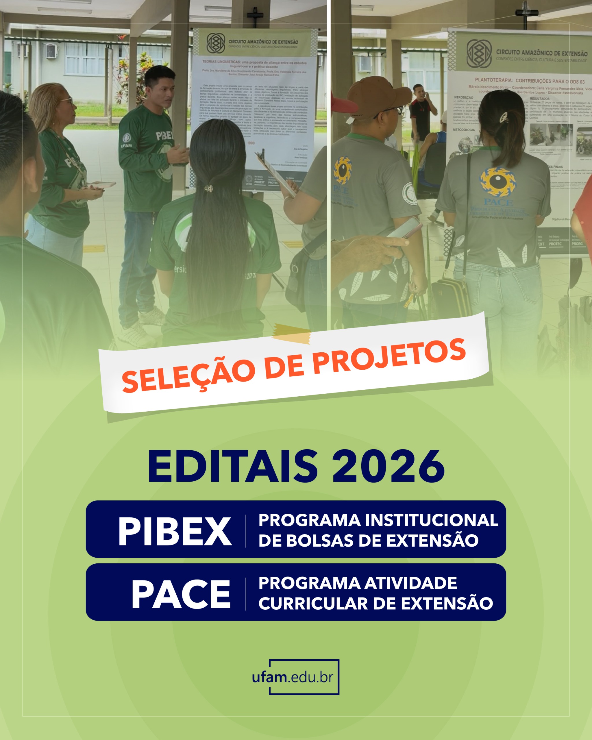 A Pró-Reitoria de Extensão (Proext) da Universidade Federal do Amazonas (Ufam) divulgou os editais de seleção de propostas de projetos para o ano de 2026 do Programa Atividade Curricular de Extensão (Pace) e do Programa Institucional de Bolsas de Extensão (Pibex).