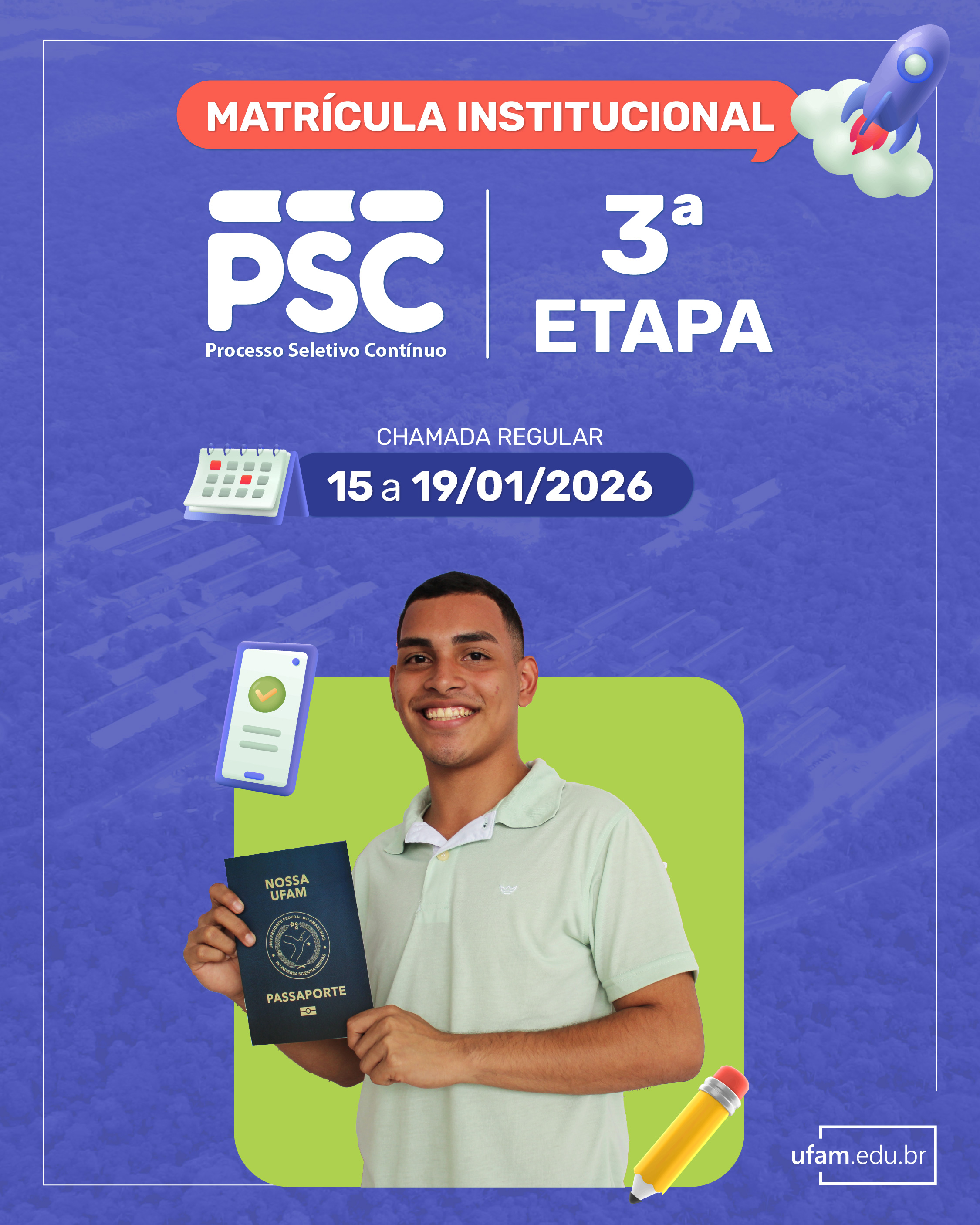 A Universidade Federal do Amazonas (Ufam), por meio da Pró-Reitoria de Ensino de Graduação (Proeg), na tarde desta quarta-feira, 14 de janeiro, publicou o Edital nº 04/2026, que estabelece os procedimentos para a Matrícula Institucional dos candidatos aprovados na chamada regular do Processo Seletivo Contínuo (PSC) 2026. O documento define prazos, documentos exigidos e critérios para confirmação das vagas.