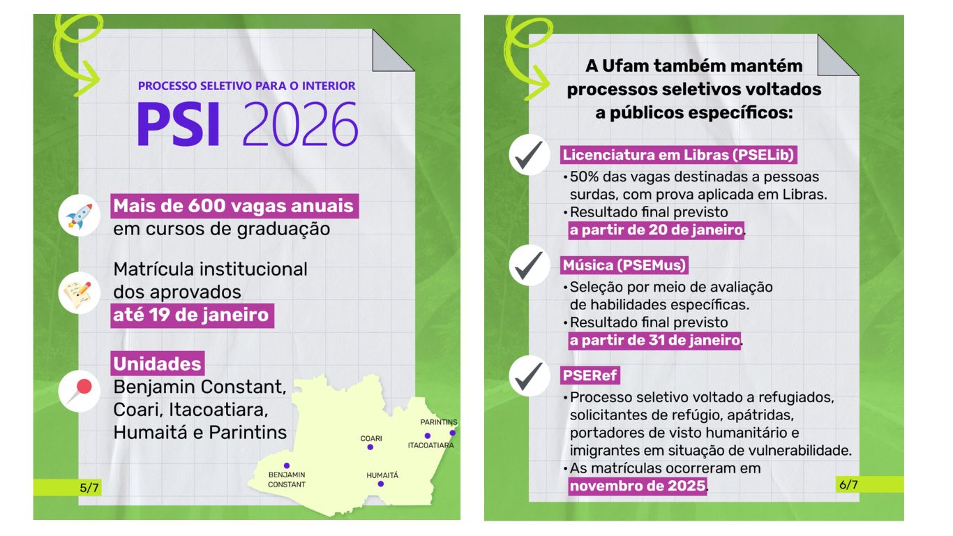 Já o Processo Seletivo para o Interior (PSI) é o comprometimento da Ufam com a interiorização do ensino superior no Amazonas. O processo oferece mais de 600 vagas anuais em cursos de graduação nas unidades acadêmicas localizadas nos municípios de Benjamin Constant, Coari, Itacoatiara, Humaitá e Parintins. As provas são aplicadas em 14 cidades do interior do estado, ampliando o acesso ao ensino superior público. A matrícula institucional dos aprovados segue até o dia 19 de janeiro.