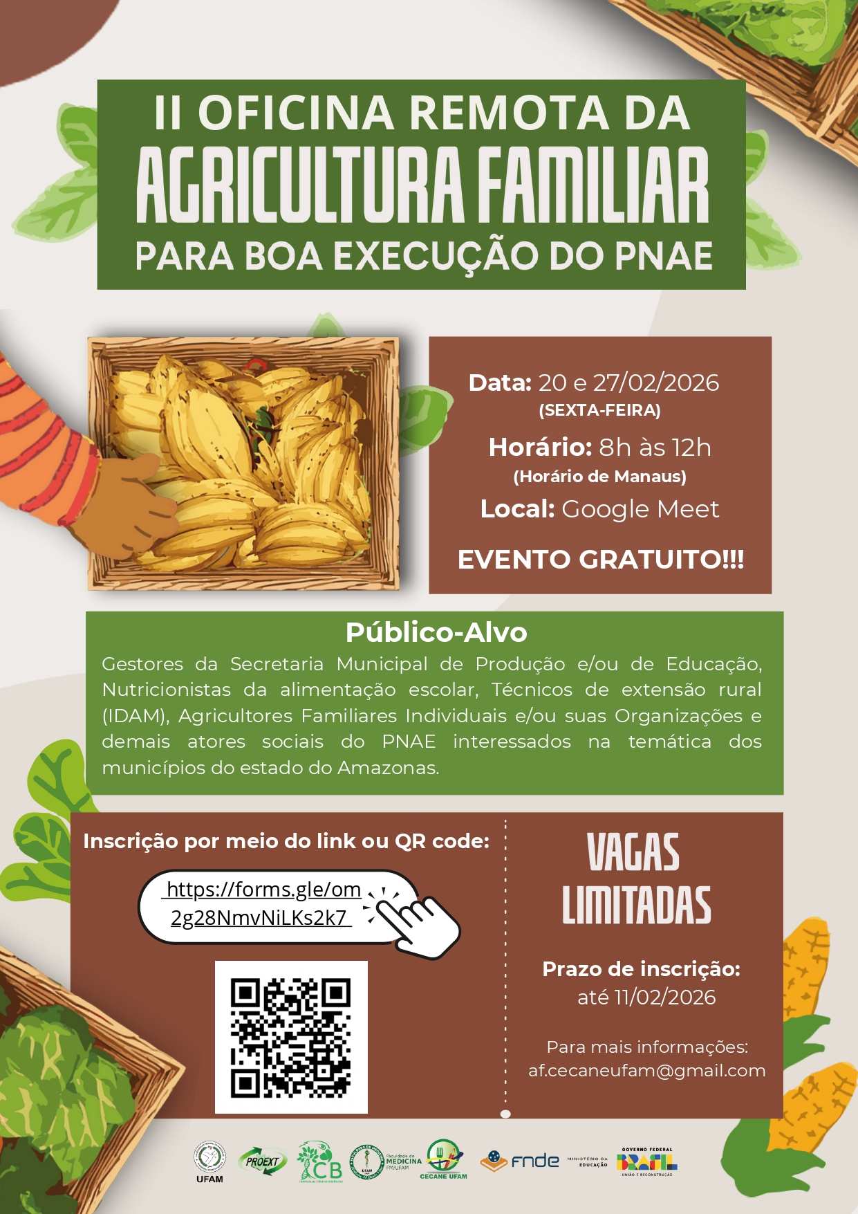 O Centro Colaborador em Alimentação e Nutrição Escolar da Universidade Federal do Amazonas (CECANE/UFAM), em parceria com o Fundo Nacional de Desenvolvimento da Educação (FNDE), realizará, em 2026, a II Oficina Remota da Agricultura Familiar para a Boa Execução do Programa Nacional de Alimentação Escolar (PNAE). A iniciativa tem como objetivo fortalecer a participação da agricultura familiar no PNAE, contribuindo para a qualificação da gestão e da execução do programa nos municípios do estado do Amazonas.