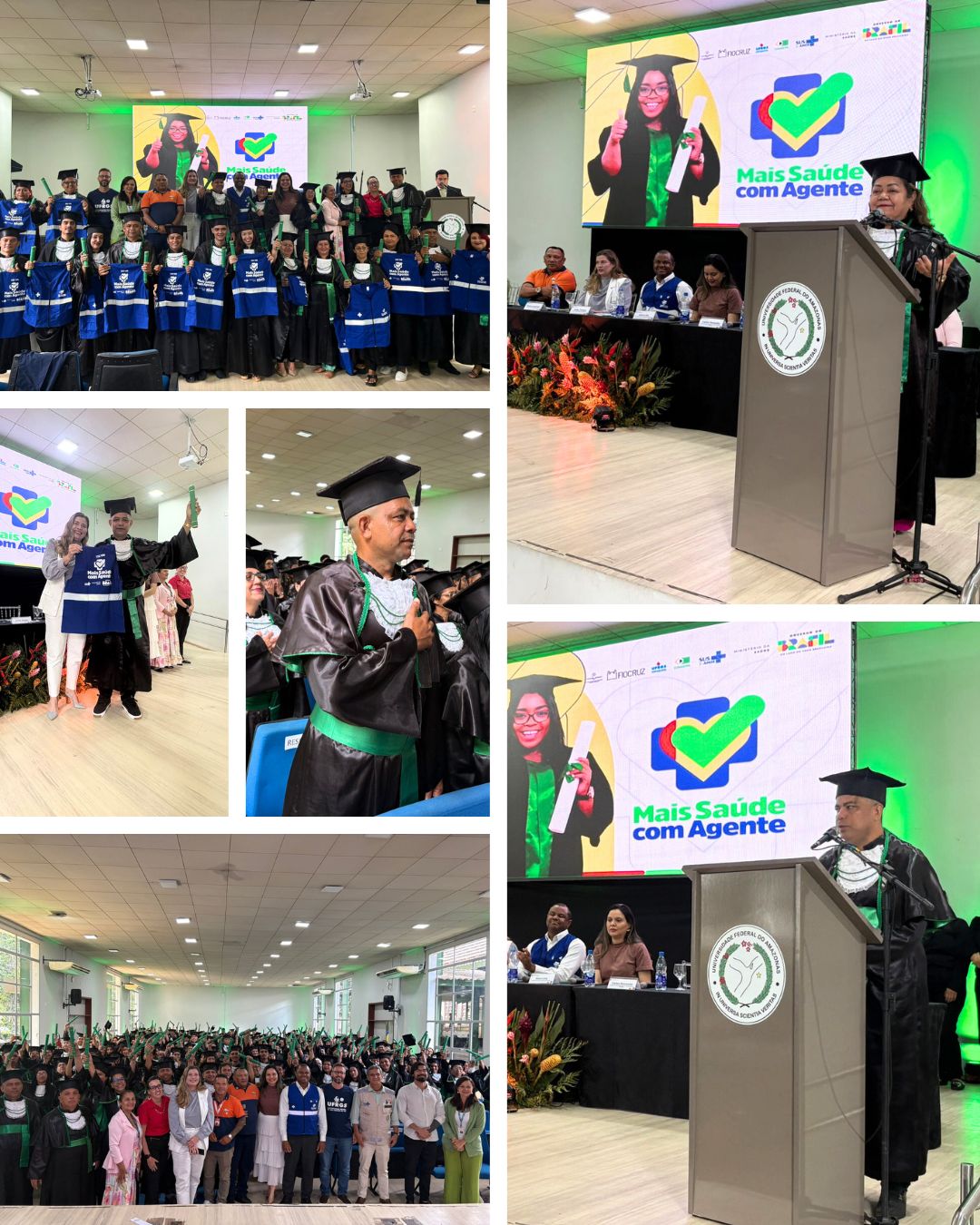 Na manhã da última quinta-feira, 5 de fevereiro, a Universidade Federal do Amazonas (Ufam) recebeu a cerimônia de conclusão dos cursos técnicos do Programa Mais Saúde com Agente. O evento reuniu 250 Agentes Comunitários de Saúde (ACS) e Agentes de Combate às Endemias (ACE) no Auditório Rio Amazonas, localizado no setor Norte. Ao todo, no estado do Amazonas, foram diplomados 2.706 ACS e 968 ACE. Com duração de 12 meses, modelo híbrido e carga horária total de 1.275 horas, os cursos tiveram como foco a atuação integrada na promoção da saúde, vigilância epidemiológica e fortalecimento da Atenção Primária.