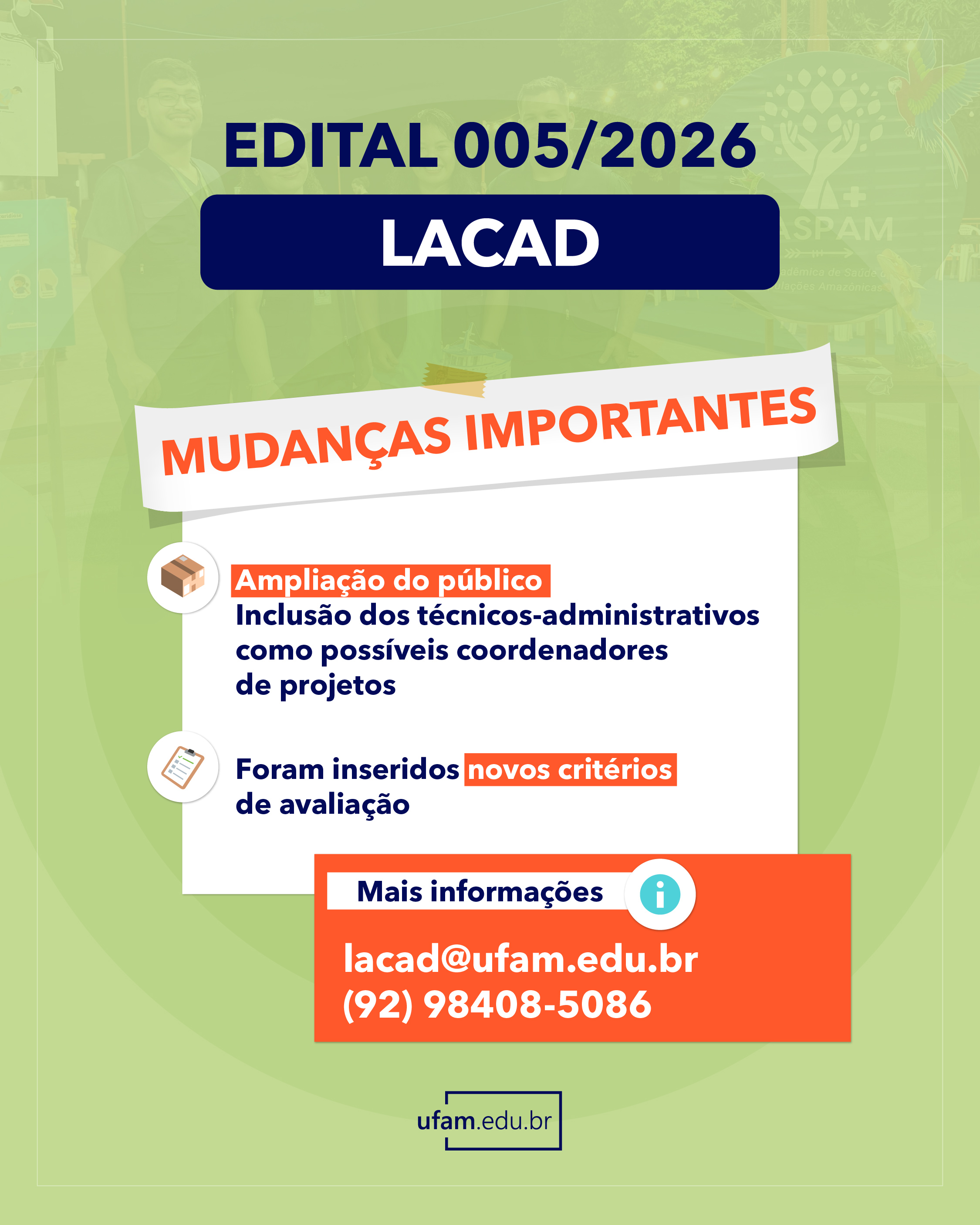 A Universidade Federal do Amazonas (Ufam), por meio da Pró-Reitoria de Extensão da UFAM (Proext), lançou o Edital nº 004/2026 para seleção de projetos vinculados ao Programa de Apoio à Realização de Cursos e Eventos (PAREC) e o Edital nº 005/2026  para seleção de projetos vinculados às Ligas Acadêmicas (Lacad). Os interessados devem fazer a submissão das propostas por meio da plataforma e-Campus, no módulo “Pesquisa e Extensão”.