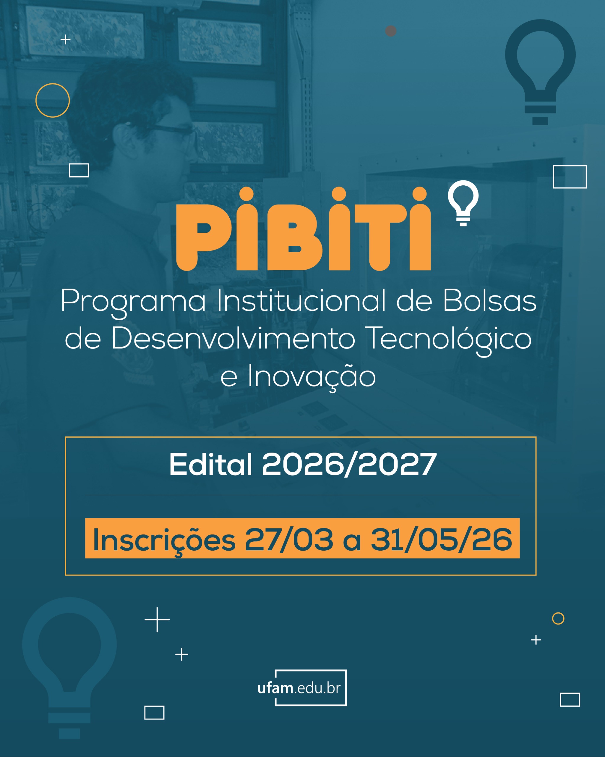 A Ufam, por meio da Pró- Reitoria de Inovação Tecnológica (Protec) publicou o edital Nº 001/2026 referente ao processo seletivo do Programa Institucional de Bolsas de Iniciação em Desenvolvimento Tecnológico e Inovação – PIBITI 2026/2027. As inscrições das propostas ocorrem online, por meio do e-campus, entre 27 de março a 31 de maio.