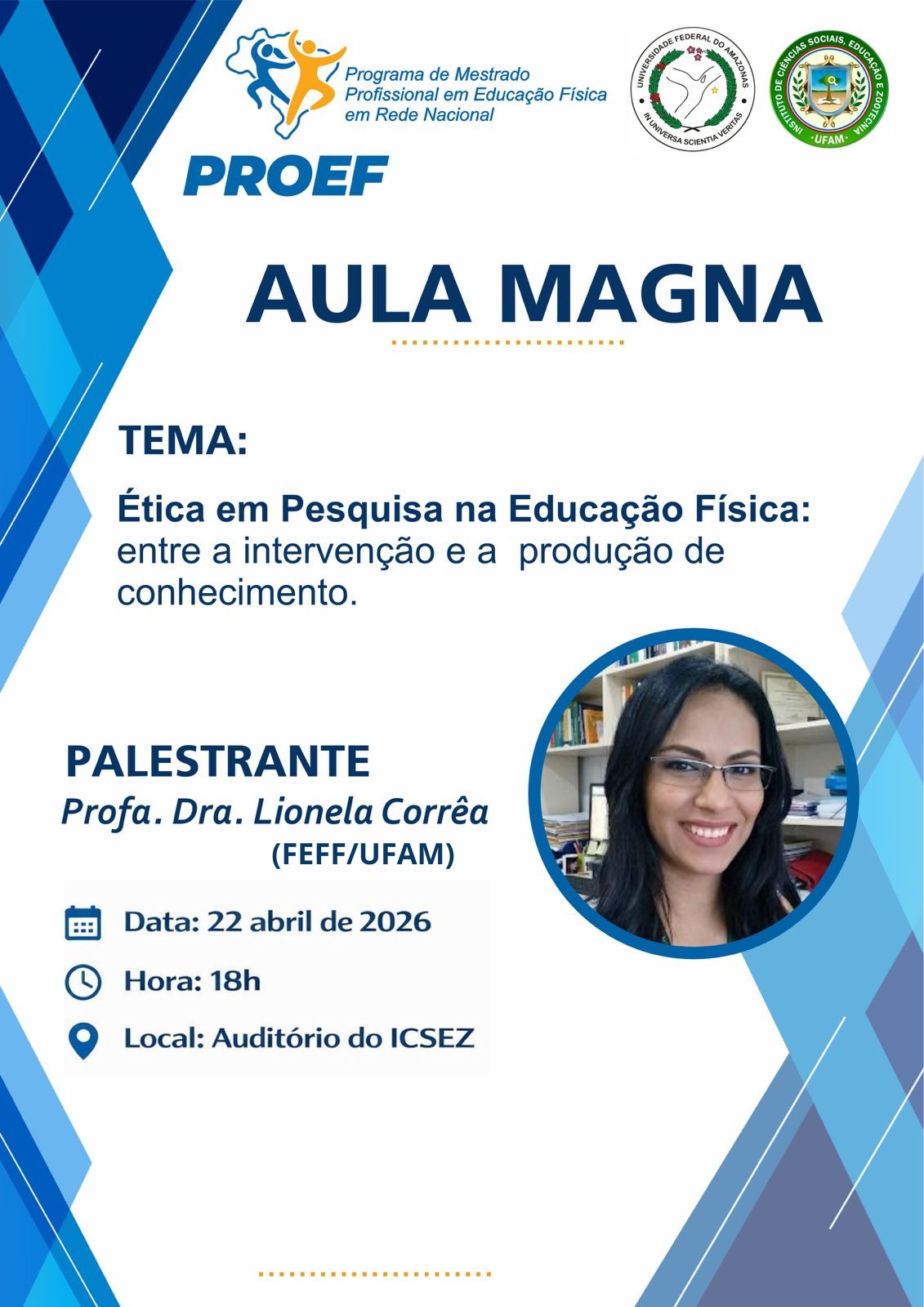 A atividade acontecerá no dia 22 de abril de 2026, às 18h, no auditório do Instituto de Ciências Sociais, Educação e Zootecnia (ICSEZ), e será ministrada pela Profa. Dra. Lionela Corrêa, da Faculdade de Educação Física e Fisioterapia (FEFF/UFAM).