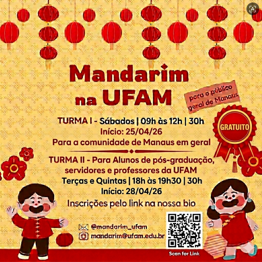 A Universidade Federal do Amazonas está com inscrições abertas para novas turmas do Curso Gratuito de Introdução ao Mandarim, em parceria com o Instituto Confúcio, a Universidade de Hubei, a Universidade Estadual Paulista e o IBRACHINA.