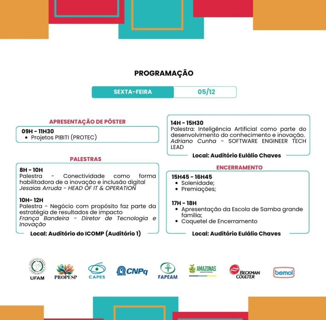Uma das participantes do evento é a Pró-Reitoria de Inovação Tecnológica (Protec), cujos bolsistas e voluntários da graduação também apresentam seus trabalhos no Conic. “Nesse sentido, nós nos diferenciamos do Pibic por apresentar resultados com características diferentes, a exemplo de produtos. Eventos como este nos ajudam a mostrar para a sociedade a contribuição da Ufam”, ressaltou o pró-reitor, professor Dalton Chaves.