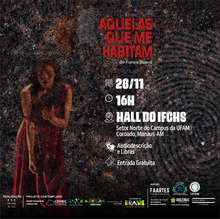 Fruto de uma parceria com a Faculdade de Artes (Faartes) e o Instituto de Filosofia, Ciências Humanas e Sociais (IFCHS) da Universidade Federal do Amazonas (Ufam), a AVA Produção Cultural apresenta hoje, 28 de novembro de 2025, às 16h, o espetáculo de dança "Aquelas que me habitam", realizado pela artista-pesquisadora Francis Baiardi. A apresentação é livre para a comunidade universitária e para visitantes.