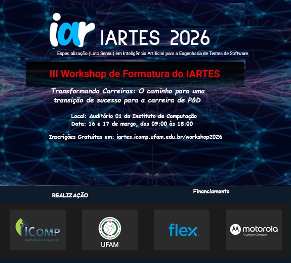 Entre os dias 16 e 17 de março, a Universidade Federal do Amazonas (Ufam), por meio do Programa de Pós-Graduação realiza o III Workshop IARTES, com o tema " Transformando Carreiras: O caminho para uma transição de sucesso para a carreira em Pesquisa e Desenvolvimento." O evento que marca a formatura da terceira turma do curso de especialização em Inteligência Artificial Aplicada a Engenharia de Teste de Software.