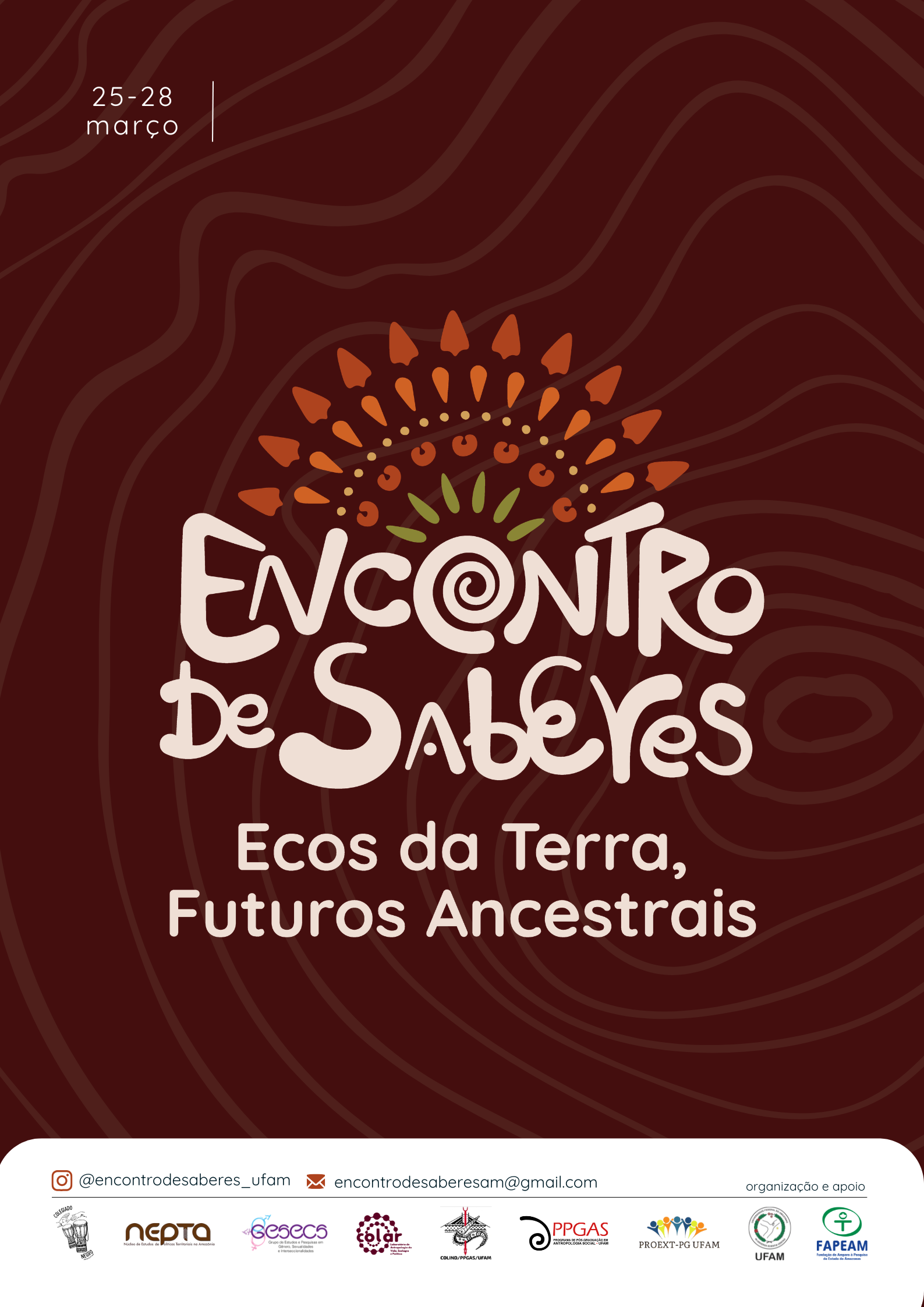 É com grande satisfação que o Programa de Pós-Graduação em Antropologia Social (PPGAS/UFAM), em parceria com a Coordenação de Curso de Licenciatura em Ciências Sociais da Universidade Federal do Amazonas, convida a todes para participar do Encontro de Saberes: Ecos da Terra, Futuros Ancestrais, a realizar-se entre os dias 25 e 28 de março de 2026, nas dependências da Universidade Federal do Amazonas, em Manaus/AM
