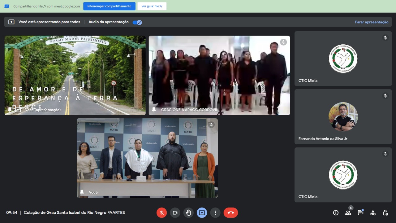 O diretor do Centro de Educação a Distância da Ufam, professor João Victor Figueiredo Cardoso Rodrigues, declarou que os trabalhos nos bastidores são pesados e começam muito antes de o espetáculo entrar no ar. “Esse momento é carregado de alegria e de orgulho para o Centro de Educação a distância, pois mais um município do interior do Amazonas chega a essa conquista pela qual tanto trabalhamos. Realizar um curso superior é difícil porque, na vida adulta, é preciso conciliar trabalho e estudo e isso é árduo. Sabemos também o quanto é difícil o deslocamento entre os próprios municípios do interior do Amazonas, o que, muitas vezes, impede a vinda de muitos para realizar um curso presencial em Manaus. Mas vocês lograram êxito, com todo o apoio da Faculdade de Artes, sempre muito parceira em todas as propostas. Nosso esforço no CED é contínuo e nossa busca por melhorias também. Não esperamos levar apenas um curso, mas a experiência em levar a Universidade para os municípios, para que vocês possam fazer a diferença no município de vocês. Quero agradecer o apoio do nosso reitor, da nossa vice- reitora e do nosso pró-reitor de Ensino. No início da transmissão tivemos algumas dificuldades, mas é onde encontramos mais dificuldade que precisamos estar. Termino minha fala parabenizando o esforço individual de vocês e desejo a todos um futuro brilhante”.