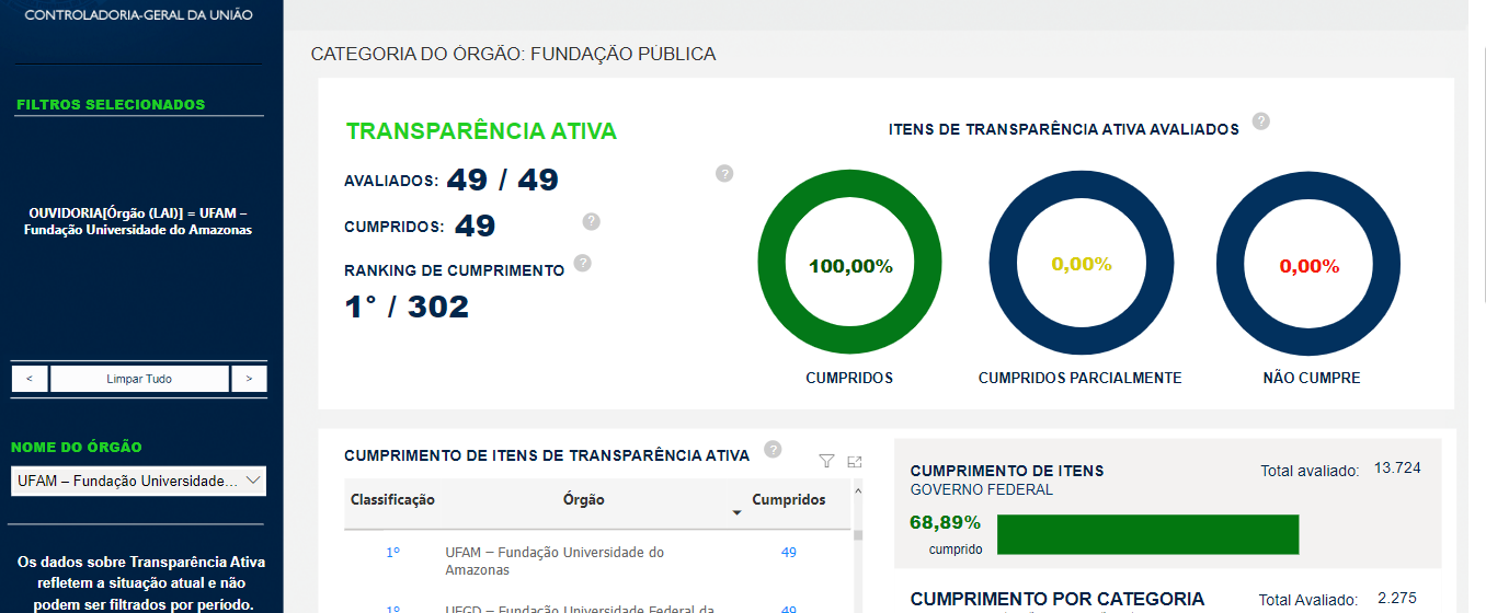 A Universidade Federal do Amazonas (Ufam), na última sexta-feira, 29 de setembro, alcançou a primeira colocação no ranking de Transparência Ativa da Controladoria Geral da União (CGU). A Universidade cumpriu todos os 49 requisitos exigidos pela CGU, entre eles “Ações e Programas”, “Dados Abertos”, “Receitas e Despesas” e “Serviço de Informação ao Cidadão (SIC)”, e ficou entre as nove universidades federais a alcançar essa marca em um universo de 302 órgãos federais.