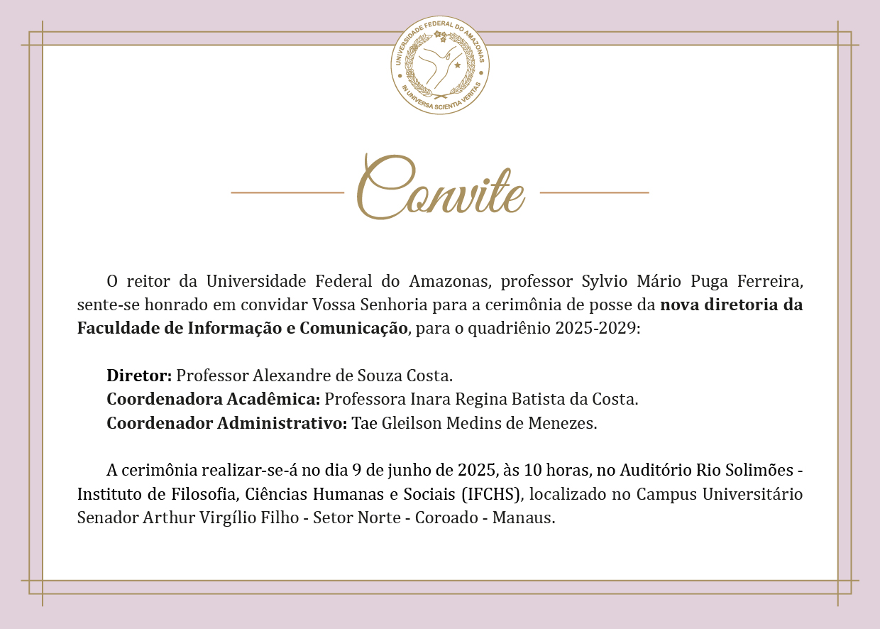 O reitor, professor Sylvio Puga, convida a comunidade universitária para prestigiar a cerimônia de posse da nova diretoria da Faculdade de Informação e Comunicação da Universidade Federal do Amazonas (FIC/Ufam), que atuará no quadriênio 2025-2029. A solenidade ocorre no dia 9 de junho, às 10h, no Auditório Rio Solimões, localizado no Instituto de Filosofia, Ciências Humanas e Sociais (IFCHS), setor Norte do Campus Sede.