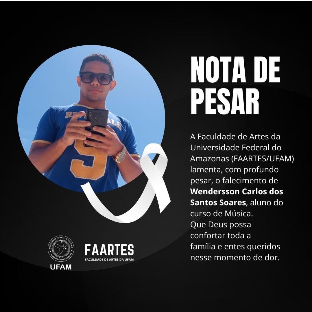 É com profundo pesar que a Administração Superior da Universidade Federal do Amazonas, em especial a Faculdade de Artes (Faartes), comunica o falecimento do discente Wenderson Carlos dos Santos Soares, ocorrido nesta quinta-feira, 2 de março de 2023, em Manaus.