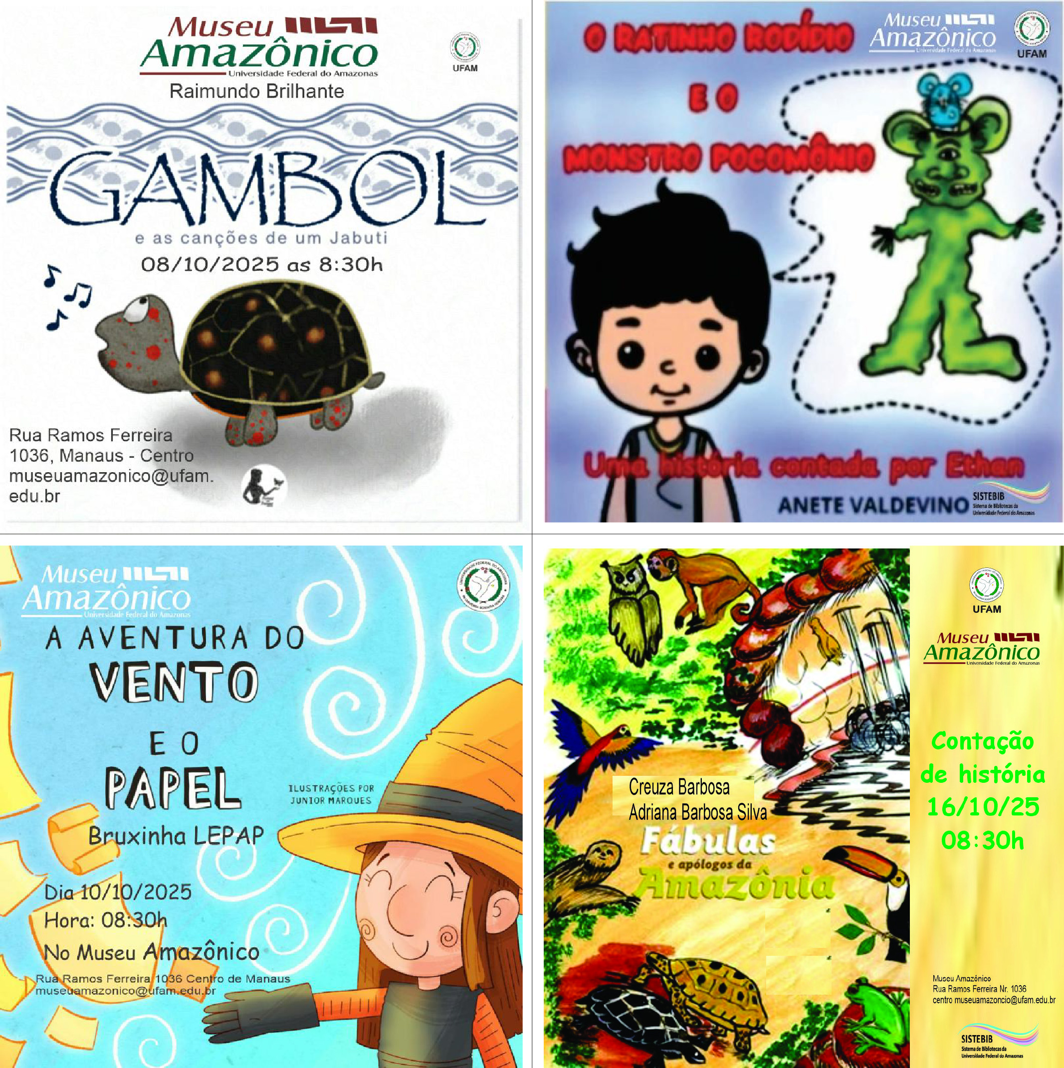 Também no dia 08 de outubro, das 8h30 às 09h30, o Museu recebe a escritora Anete Valdevino para contar “O Ratinho Rodídio e o Monstro Pocomônio: Uma história contada por Ethan”, que surgiu de uma brincadeira divertida com massinha de modelar. A brincadeira inspirou a construção de uma história que envolve roedor, monstro e suas personalidades. Foram construídos personagens com a utilização de massinha de modelar e, enquanto eram elaborados, acontecia uma conversa sobre as fisionomias das personalidades, gostos e medos.