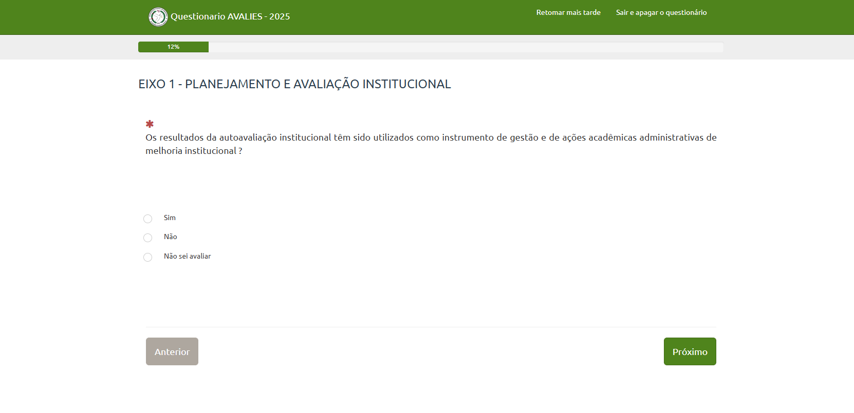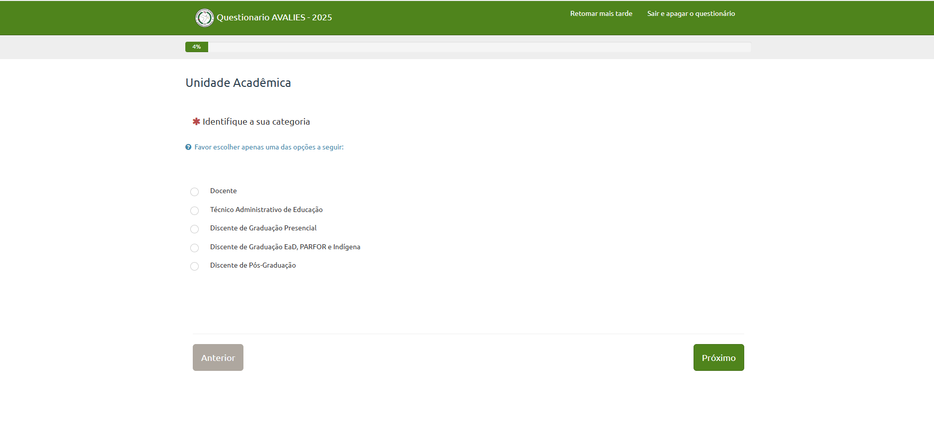 Para responder ao Avalies 2025 não é necessário se identificar. Não será solicitado qualquer documento pessoal. Você responderá a primeira questão sobre sua unidade acadêmica e em seguida sobre o seu segmento, se TAE, discente ou docente, a partir dela, serão apresentadas as demais perguntas referentes ao seu segmento específico. Veja a seguir alguns exemplos: