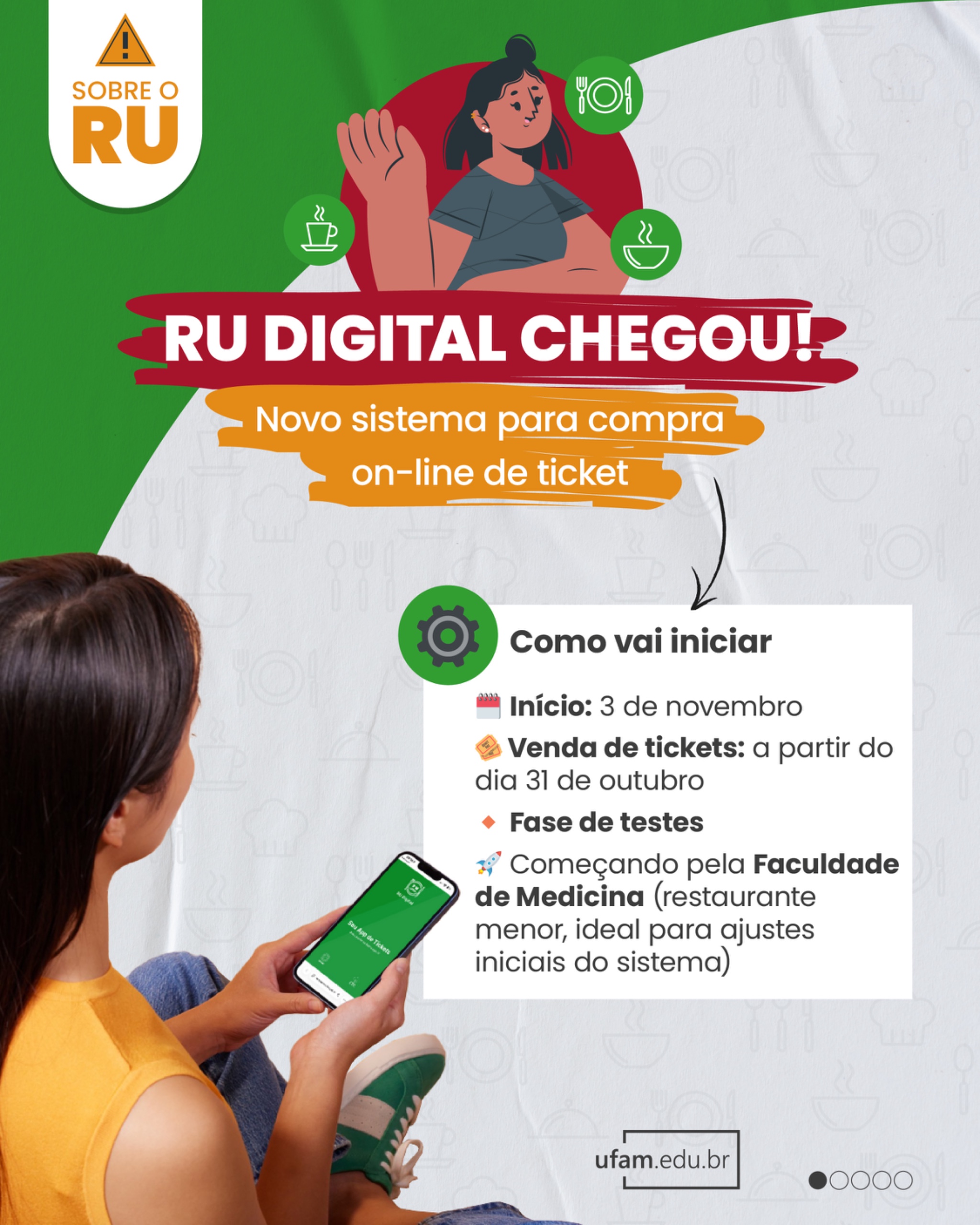 A Universidade Federal do Amazonas (Ufam) lança um novo serviço para o público de usuários dos Restaurantes Universitários, o “RU Digital”. Já a partir de hoje, sexta-feira (31), o sistema piloto está disponível para os usuários do restaurante da Faculdade de Medicina (FM), na forma de piloto, contemplando os serviços de compra de tickets e acompanhamento de saldo. Na segunda-feira, 3, terá início a fase de utilização dos tickets naquele RU. Por ser o menor da Ufam, ele funciona como espaço ideal para os eventuais ajustes no sistema antes da sua extensão aos demais RUs.