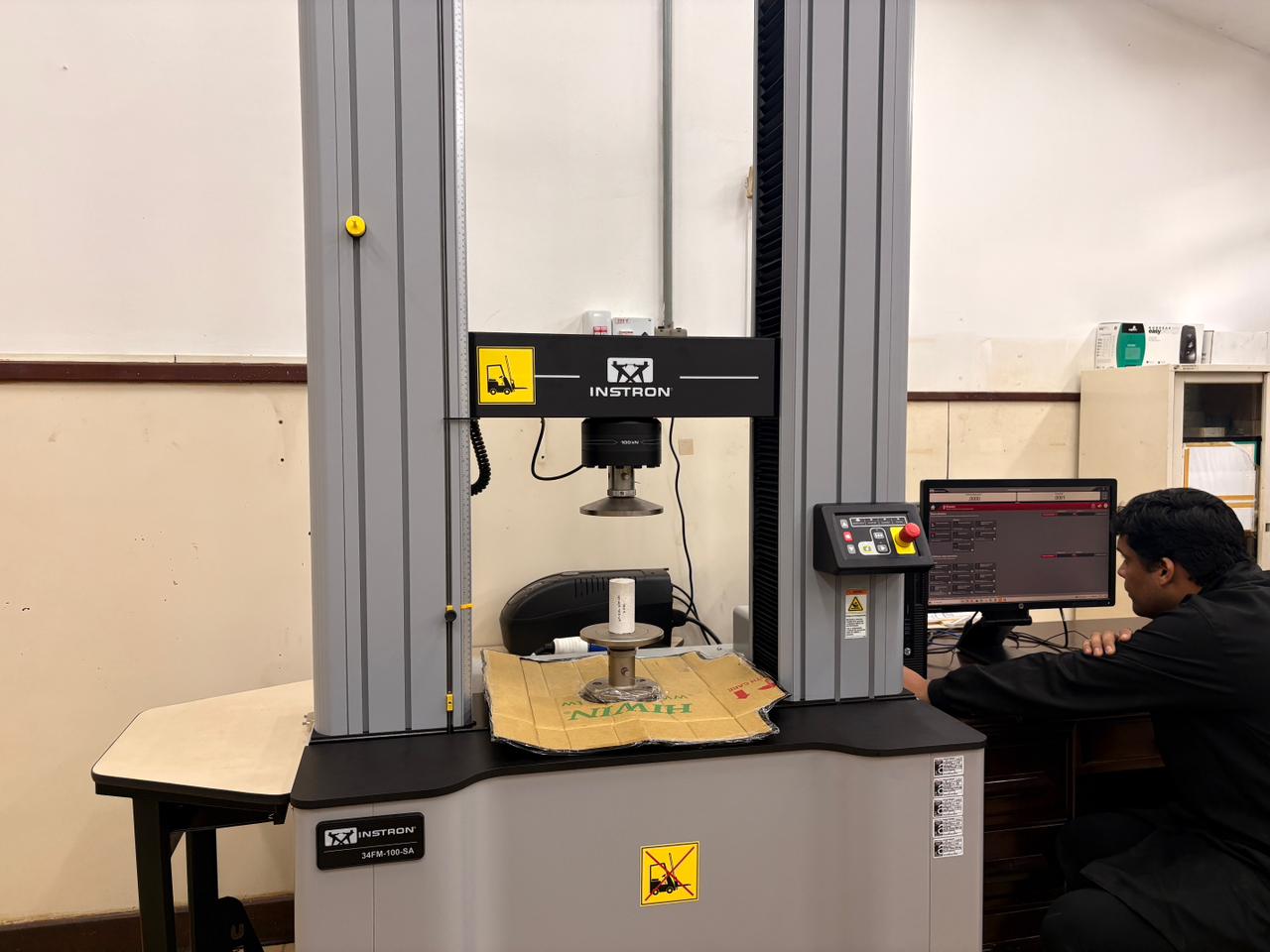 Além da instalação, foi realizado um treinamento para docentes e técnico- administrativos em educação (TAEs) daquela unidade acadêmica, o qual foi conduzido por um técnico especializado da Instron, fabricante da máquina.