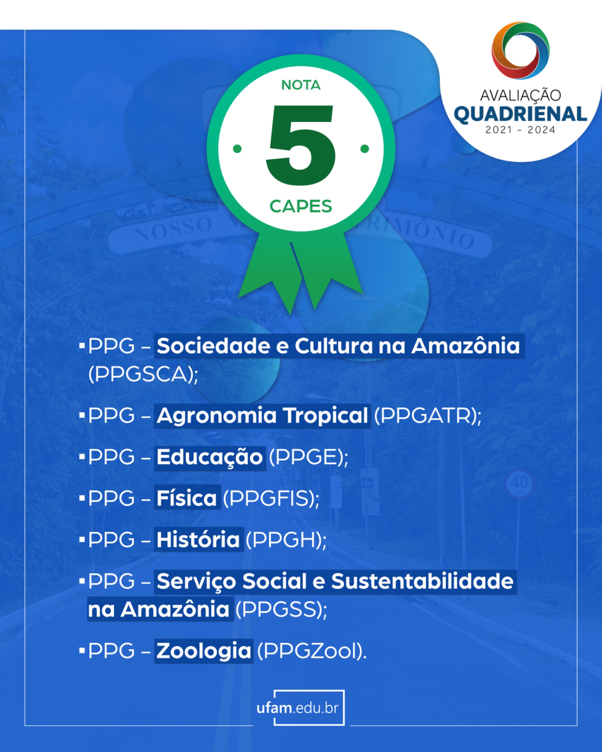 Entre os PPGs criados pela Universidade, aqueles que saíram da nota 4 para a nota 5 na última avaliação quadrienal foram estes: Sociedade e Cultura na Amazônia (PPGSCA), Agronomia Tropical (PPGATR), Educação (PPGE), Física (PPGFIS), História (PPGH), Serviço Social e Sustentabilidade na Amazônia (PPGSS) e Zoologia (PPGZool). Além deles, o Programa de Doutorado em Matemática (PDM) em Associação Ampla entre a UEPA e a Ufam, o Mestrado Profissional em Rede Nacional para o Ensino das Ciências Ambientais (PROFCIAmb), e os PPGs da Rede em Inovação Farmacêutica (PPGIF) e da Rede Educanorte - Educação na Amazônia também avançaram do conceito 4 para o 5 na avaliação.
