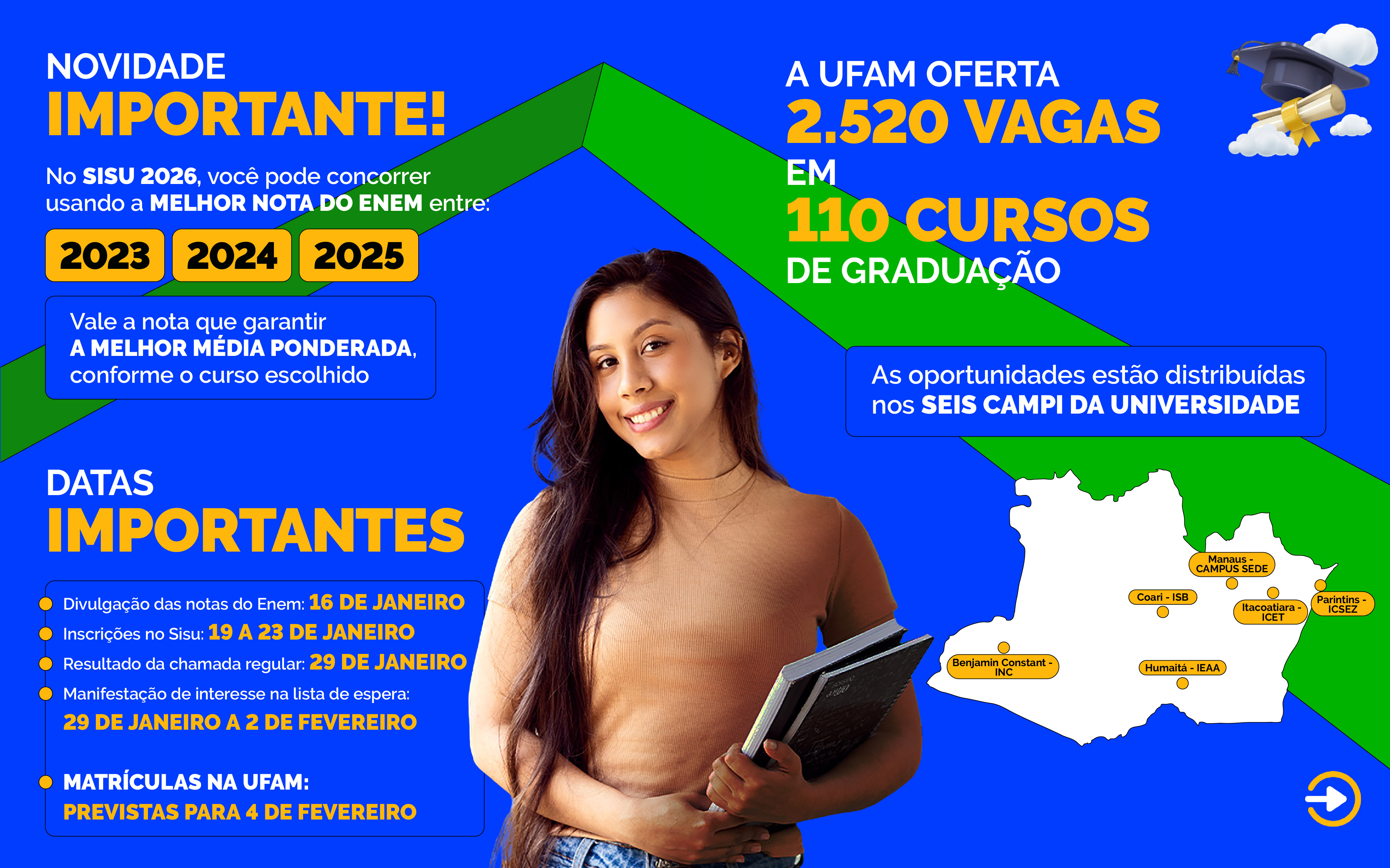 A pró-reitora de Ensino de Graduação da Ufam, Silvia Conde, destaca que a Ufam é uma instituição respeitada na Amazônia e no Brasil, com formação de qualidade e socialmente referenciada. Silvia Conde convida os candidatos do Sisu 2026 a optarem por cursos de graduação da universidade: “Se você fez o Enem, agora é o momento de se inscrever no Sisu! Quero fazer um convite especial: venha estudar na Universidade Federal do Amazonas. A Ufam é um espaço de oportunidades, troca de ideias e construção de sonhos, que forma para a vida e para o mundo do trabalho. Aqui, você encontra ensino de qualidade, professores qualificados, projetos de pesquisa e extensão, além de políticas de assistência estudantil que ajudam você a permanecer e concluir sua graduação. Escolher a Ufam é escolher uma formação crítica, que amplia horizontes e contribui para a transformação da Amazônia e do Brasil”, incentiva.