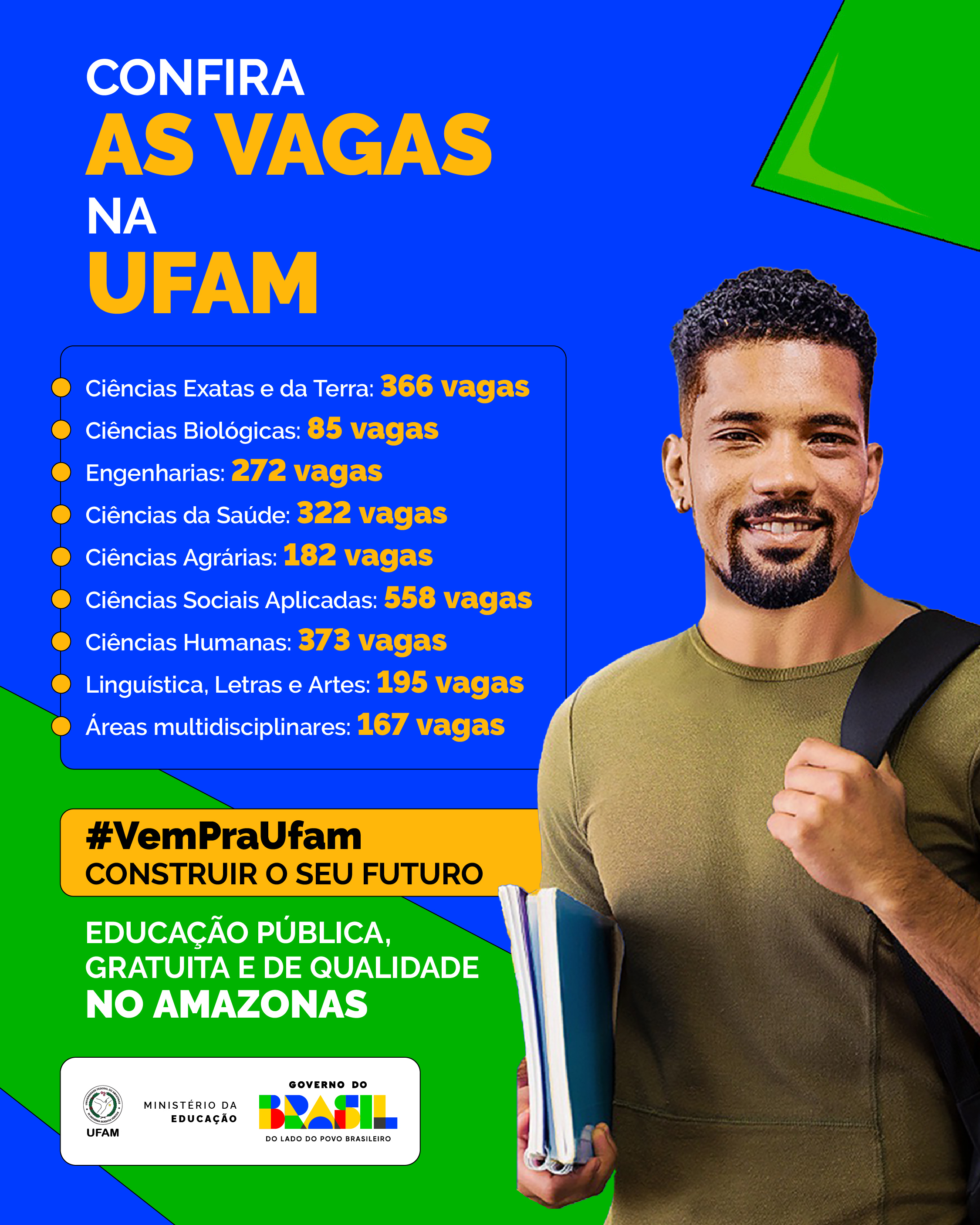 Na Ufam, os candidatos podem optar por cursos de graduação distribuídos nos seis campi da universidade, localizados em Manaus, Benjamin Constant, Coari, Itacoatiara, Humaitá e Parintins. A área de Ciências Sociais Aplicadas apresenta o maior número de vagas, 558, distribuídas em 20 cursos.