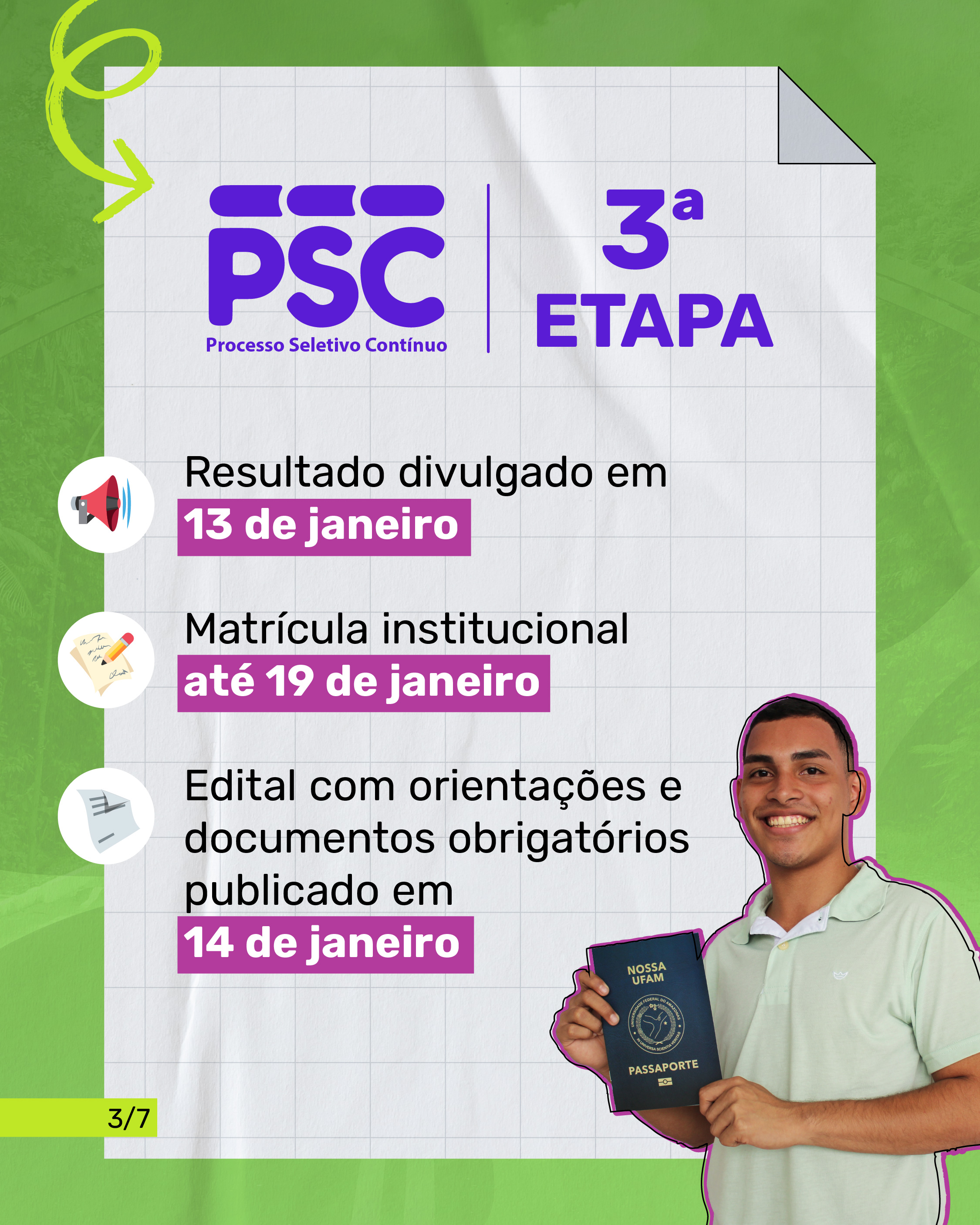No Processo Seletivo Contínuo (PSC – 3ª etapa), o resultado foi divulgado na última terça-feira, 13 de janeiro. A fase atual consiste no acompanhamento dos candidatos aprovados quanto à matrícula institucional, que vai até dia 19 de janeiro. O edital com as orientações, prazos e lista de documentos exigidos foi publicado nesta quarta-feira, 14 de janeiro, e deve ser consultado atentamente pelos convocados para garantir a efetivação da vaga.