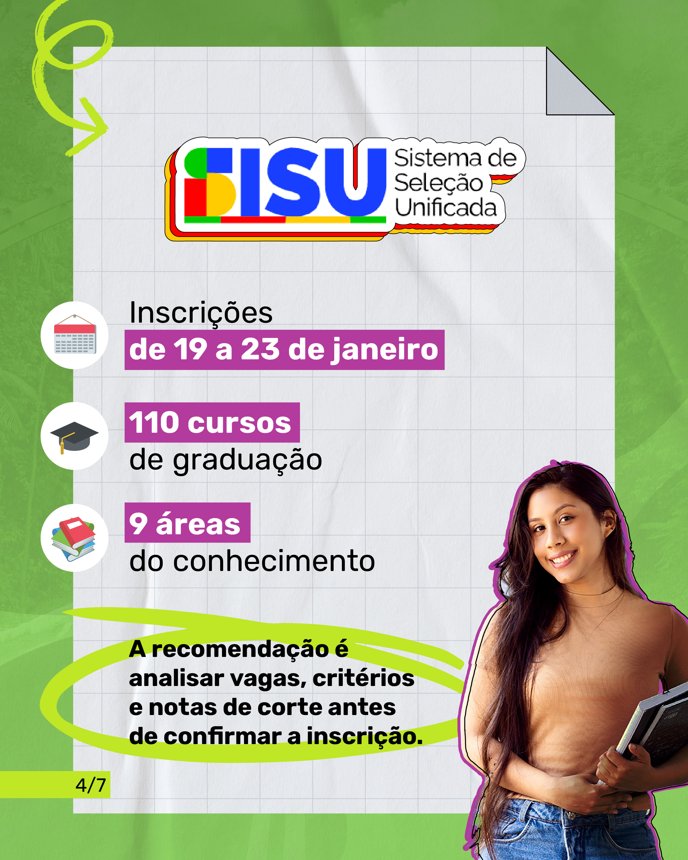 Outra importante forma de ingresso é o Sistema de Seleção Unificada (Sisu). As inscrições ocorrem no período de 19 a 23 de janeiro, por meio da nota do Exame Nacional do Ensino Médio (Enem). A Ufam disponibiliza vagas em 110 cursos de graduação, em nove áreas de conhecimento, e a recomendação é que os candidatos analisem com cuidado a quantidade de vagas, os critérios de seleção e as notas de corte antes de confirmar suas opções durante o período de inscrição.