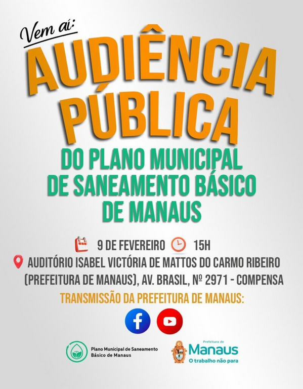 A comunidade acadêmica da Universidade Federal do Amazonas (Ufam) está convidada a participar e contribuir, nesta segunda-feira, 9 de fevereiro, da “Audiência Pública do Plano Municipal de Saneamento Básico de Manaus - AM”. O evento ocorre a partir das 15h, no Auditório Isabel Victoria de Mattos Pereira do Carmo Ribeiro, localizado na sede do Executivo Municipal, na Avenida Brasil, bairro Compensa.