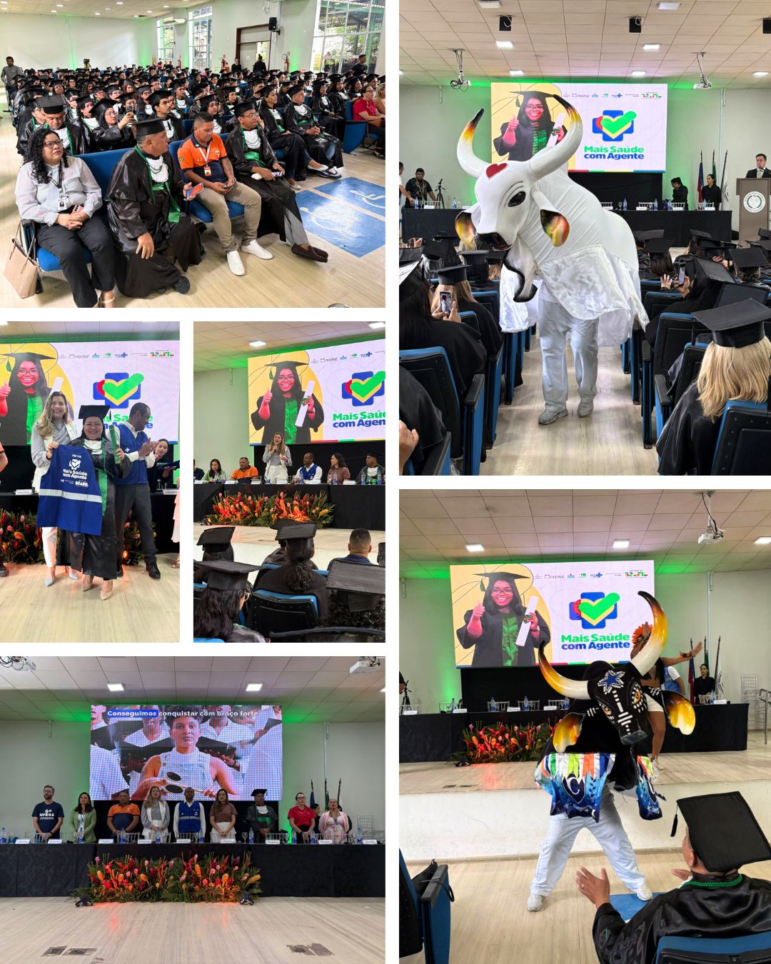 Na manhã da última quinta-feira, 5 de fevereiro, a Universidade Federal do Amazonas (Ufam) recebeu a cerimônia de conclusão dos cursos técnicos do Programa Mais Saúde com Agente. O evento reuniu 250 Agentes Comunitários de Saúde (ACS) e Agentes de Combate às Endemias (ACE) no Auditório Rio Amazonas, localizado no setor Norte. Ao todo, no estado do Amazonas, foram diplomados 2.706 ACS e 968 ACE. Com duração de 12 meses, modelo híbrido e carga horária total de 1.275 horas, os cursos tiveram como foco a atuação integrada na promoção da saúde, vigilância epidemiológica e fortalecimento da Atenção Primária.
