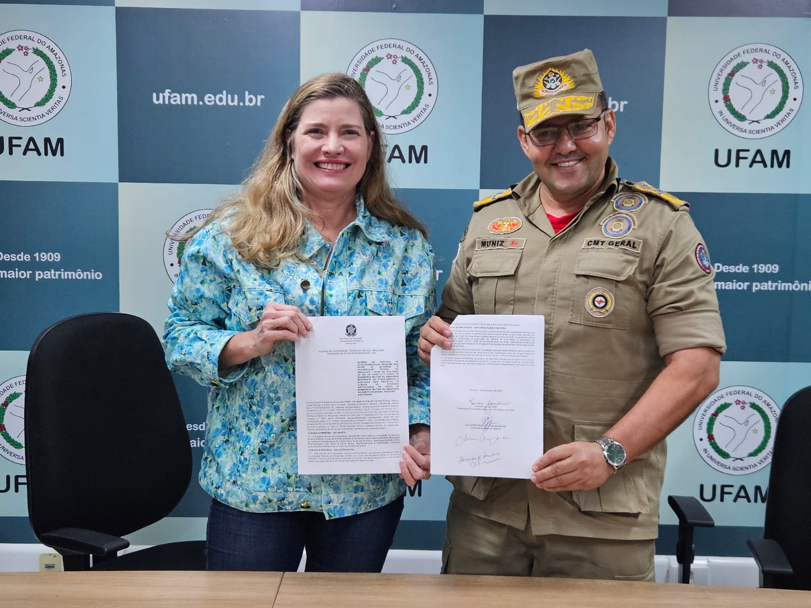 O ACT foi assinado pela reitora da Ufam, Tanara Lauschner, e pelo comandante-geral do CBMAM, Orleilso Ximenes Muniz. Estiveram presentes na solenidade o chefe de Gabinete da Reitoria da Ufam, Alexandre Passito de Queiroz, a pró-reitora de Pesquisa e Pós-Graduação, Adriana Malheiro Alle Marie, a assessora especial da Assessoria de Relações Internacionais e Interinstitucionais (Arii/Ufam), Sheila Mota, o diretor do Centro de Ciências do Ambiente (CC/Ufam), André Luiz Alencar de Mendonça, e o coordenador do Programa de Pós-Graduação em Ciências Florestais e Ambientais (PPGCIFA/Ufam), Rogério Fonseca.