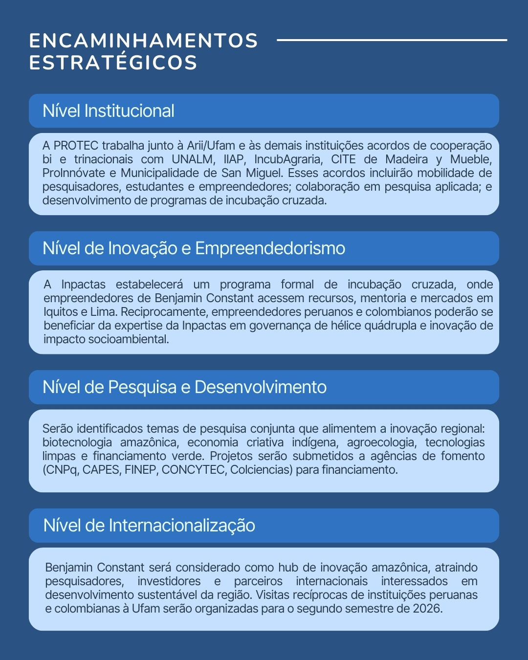 A comitiva foi convidada a apresentar o microcosmo de inovação desenvolvido em Benjamin Constant, caracterizado como um laboratório vivo de experimentação de um modelo de desenvolvimento integrativo. De acordo com a diretora de Empreendedorismo e Habitats de Inovação da Protec, professora Maria Angélica Corrêa, a internacionalização é sobre construir liderança regional pan-amazônia.