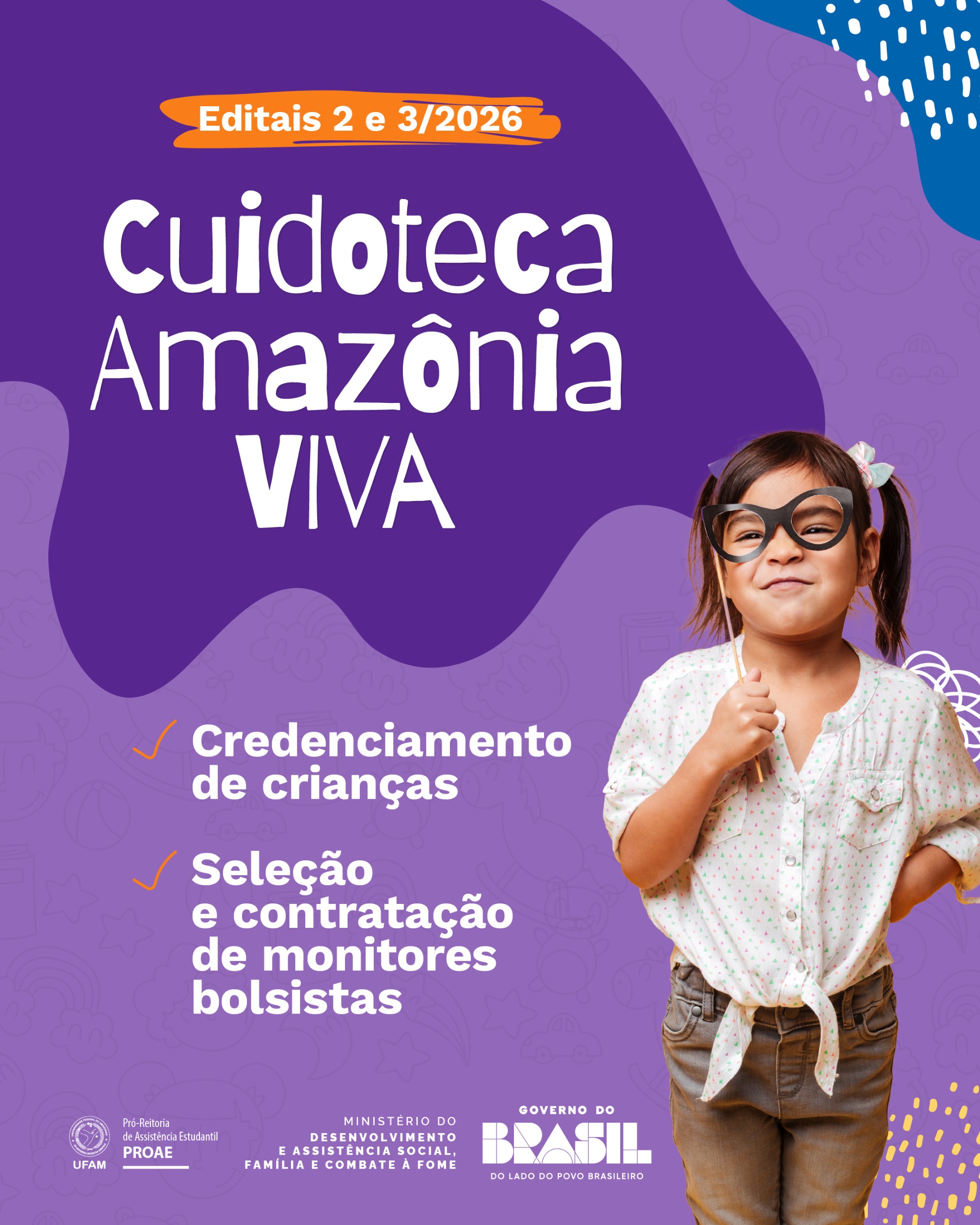 A Universidade Federal do Amazonas (Ufam), por meio da Pró-Reitoria de Assistência Estudantil (Proae), publicou os Editais nº 02/2026 e nº 03/2026, que tratam, respectivamente, da seleção de monitores/as bolsistas e do credenciamento de crianças para a Cuidoteca Amazônia Viva - Cuidar e Pertencer, referente ao ano letivo de 2026.