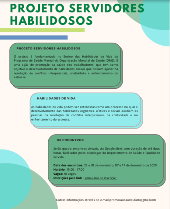 Os interessados em participar do Projeto Servidores Habilidosos têm até o dia 20 de novembro, às 12h, para realizar as inscrições AQUI. A atividade, baseada no programa de ensino de habilidade de vida no ambiente de trabalho, abrange pontos emocionais, sociais e cognitivos dos servidores e é coordenada pelas equipes de Psicologia de Saúde e Segurança do Trabalho e de Desenvolvimento Social do Departamento de Saúde e Qualidade de Vida da Universidade Federal do Amazonas (DSQV/Ufam).