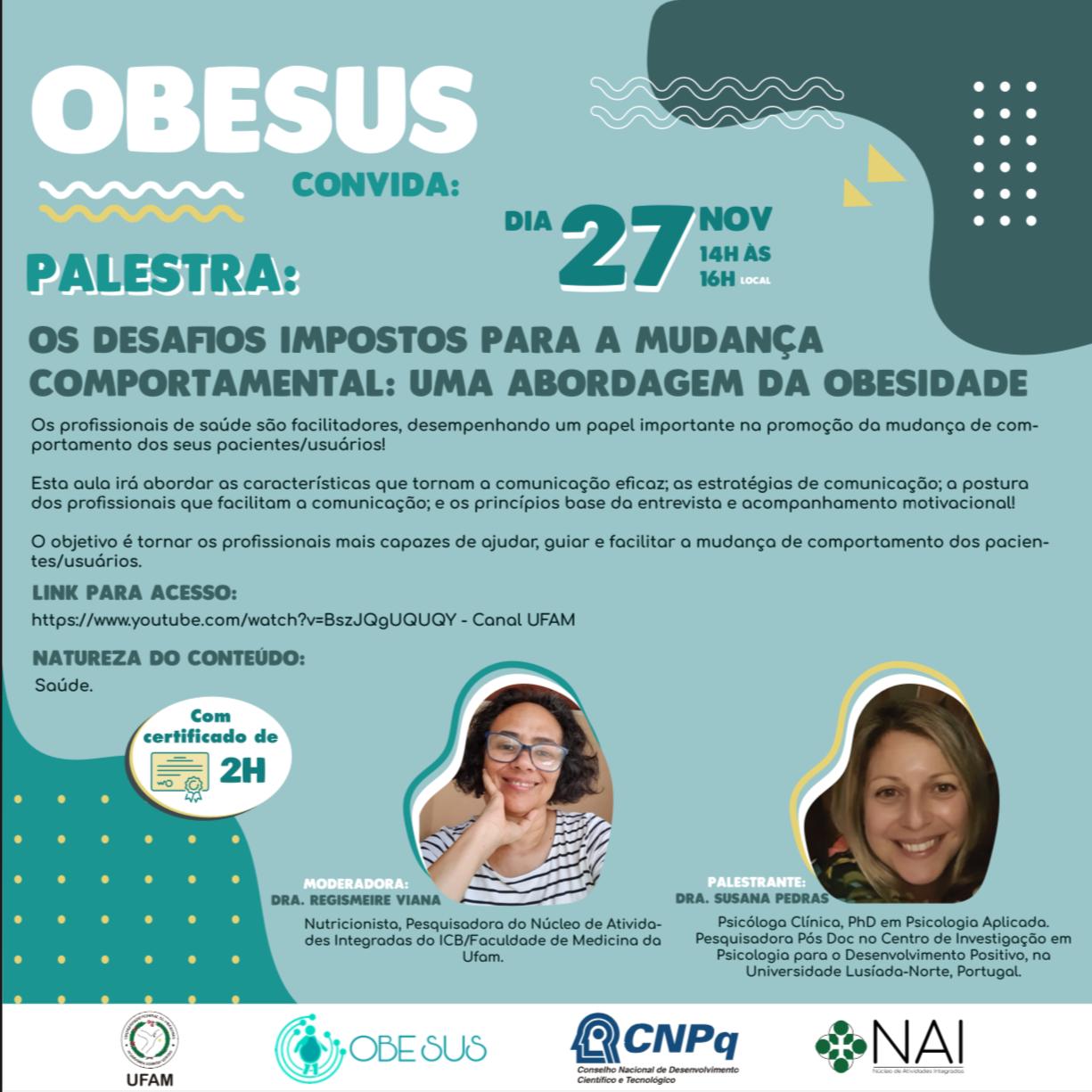 A palestra contará com certificação de 2 horas, não necessita de inscrição e tem como público-alvo profissionais e estudantes da área de saúde e áreas afins. O evento é parte integrante das aulas do Curso de Educação Profissional para Prevenção e Tratamento da Obesidade no SUS, promovido pelo Projeto OBESUS para os profissionais da saúde do Amazonas.