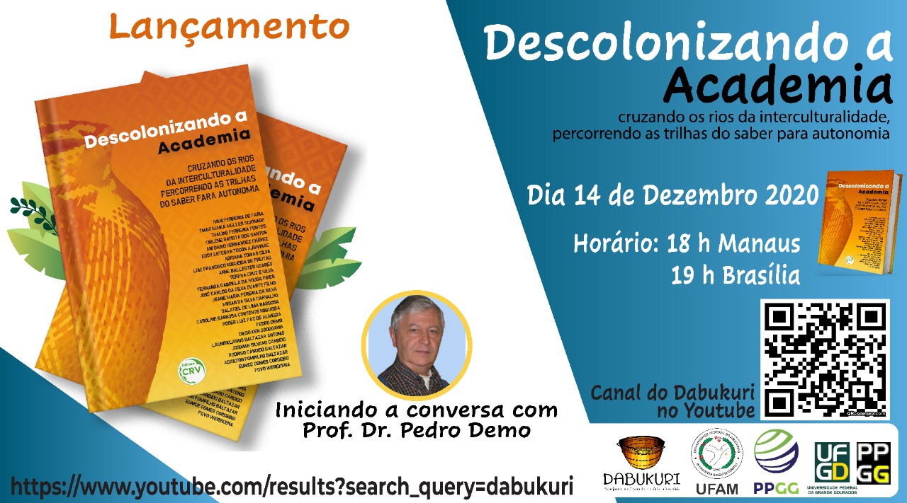 O Laboratório Dabukuri – Planejamento e Gestão do Território na Amazônia – espaço vinculado ao Departamento de Geografia da Universidade Federal do Amazonas - promove na próxima segunda-feira, dia 14, às 18h (no horário de Manaus e 19h, horário oficial de Brasília), pelo canal do Dabukuri no Youtube, o lançamento do livro “Descolonizando a academia: cruzando os rios da interculturalidade, percorrendo as trilhas da descolonização do saber e da ciência rumo à autonomia”.