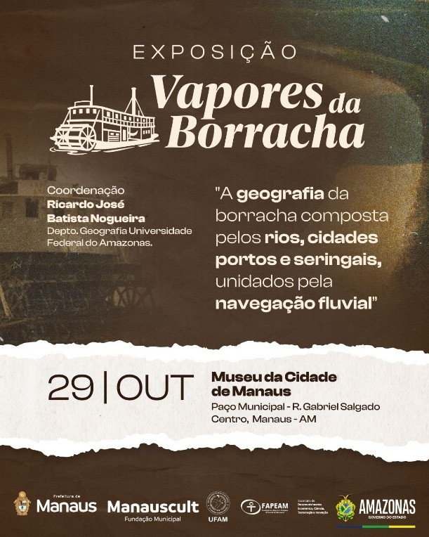“A geografia da borracha composta pelos rios, cidades, portos e seringais, unidos pela Navegação Fluvial”. É dessa forma que se resume a exposição intitulada Vapores da Borracha – Memória em Movimento, coordenada pelo docente e pesquisador do Departamento de Geografia do Instituto de Filosofia, Ciências Humanas e Sociais da Universidade Federal do Amazonas (IFCHS/Ufam) Ricardo José Batista Nogueira. A exposição inicia nesta quarta-feira, 29, às 9h30, e tem lugar do Museu da Cidade de Manaus, localizado no Paço Municipal – Rua Gabriel Salgado, Centro.