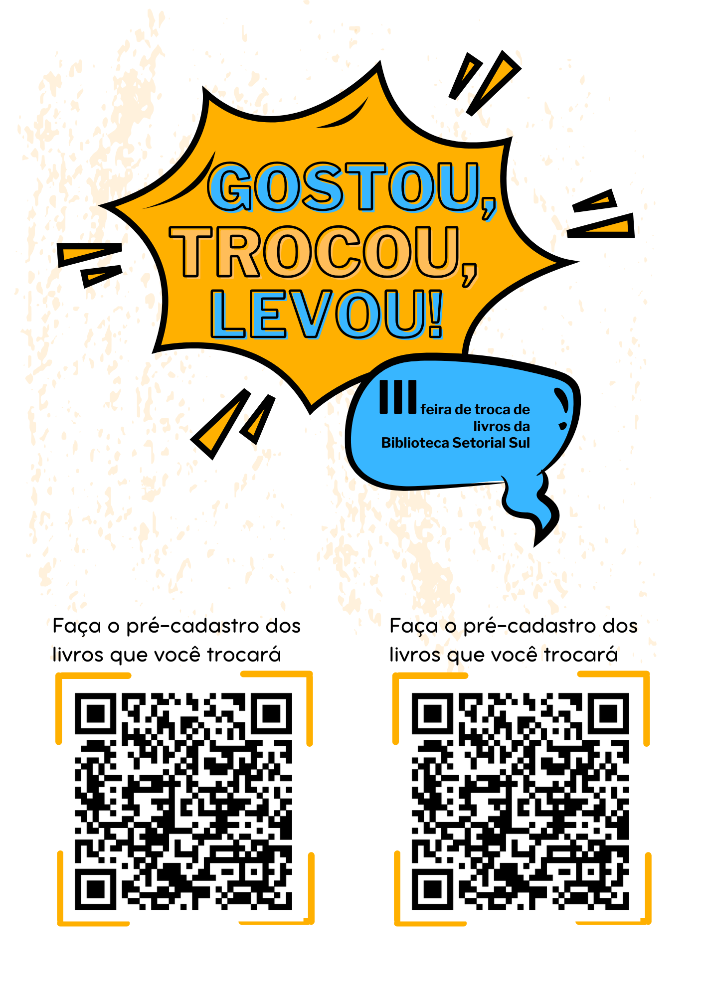 Em sua terceira edição, a Feira de Troca de Livros da Biblioteca Setorial Sul da Universidade Federal do Amazonas (Ufam) será realizada no próximo dia 7 de novembro, das 11 às 14h. Para participar, basta o interessado cadastrar os livros que deseja trocar e depois levá-los à Biblioteca até o dia 6 de novembro. Ele receberá vouchers que garantem a participação na Feira e com os quais ele poderá adquirir outros materiais. Leia o regulamento aqui.