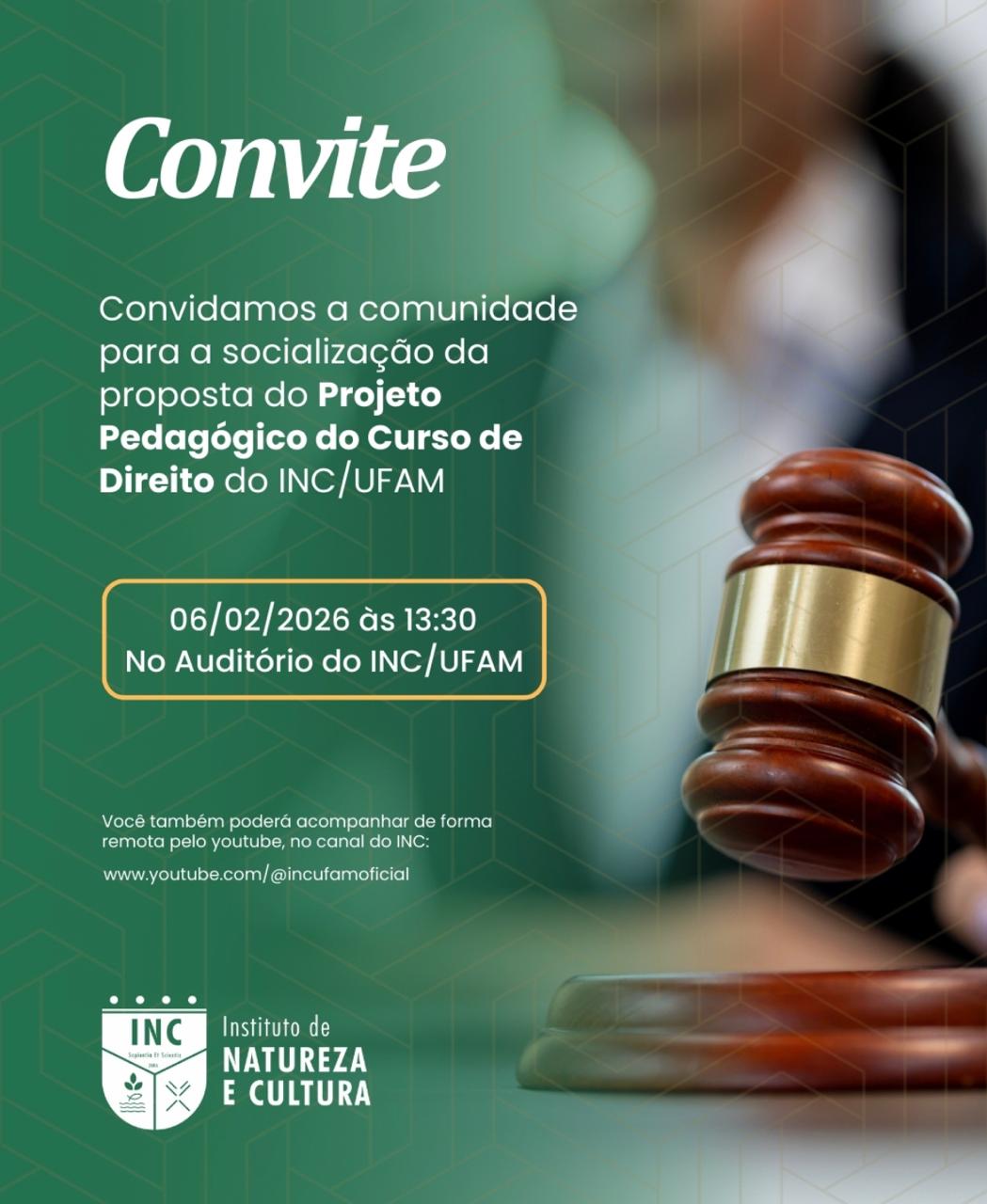No dia 6 de fevereiro de 2026, será apresentada e debatida com a comunidade acadêmica e a sociedade local e do entorno a Proposta do Projeto Pedagógico do Curso de Direito do Instituto de Natureza e Cultura da Universidade Federal do Amazonas (INC/Ufam). O evento será no Auditório do INC, às 14h30 de Manaus e 13h30 no fuso local (BC). Além disso, terá transmissão ao vivo no canal www.youtube.com/@incufamoficial para as pessoas interessadas.