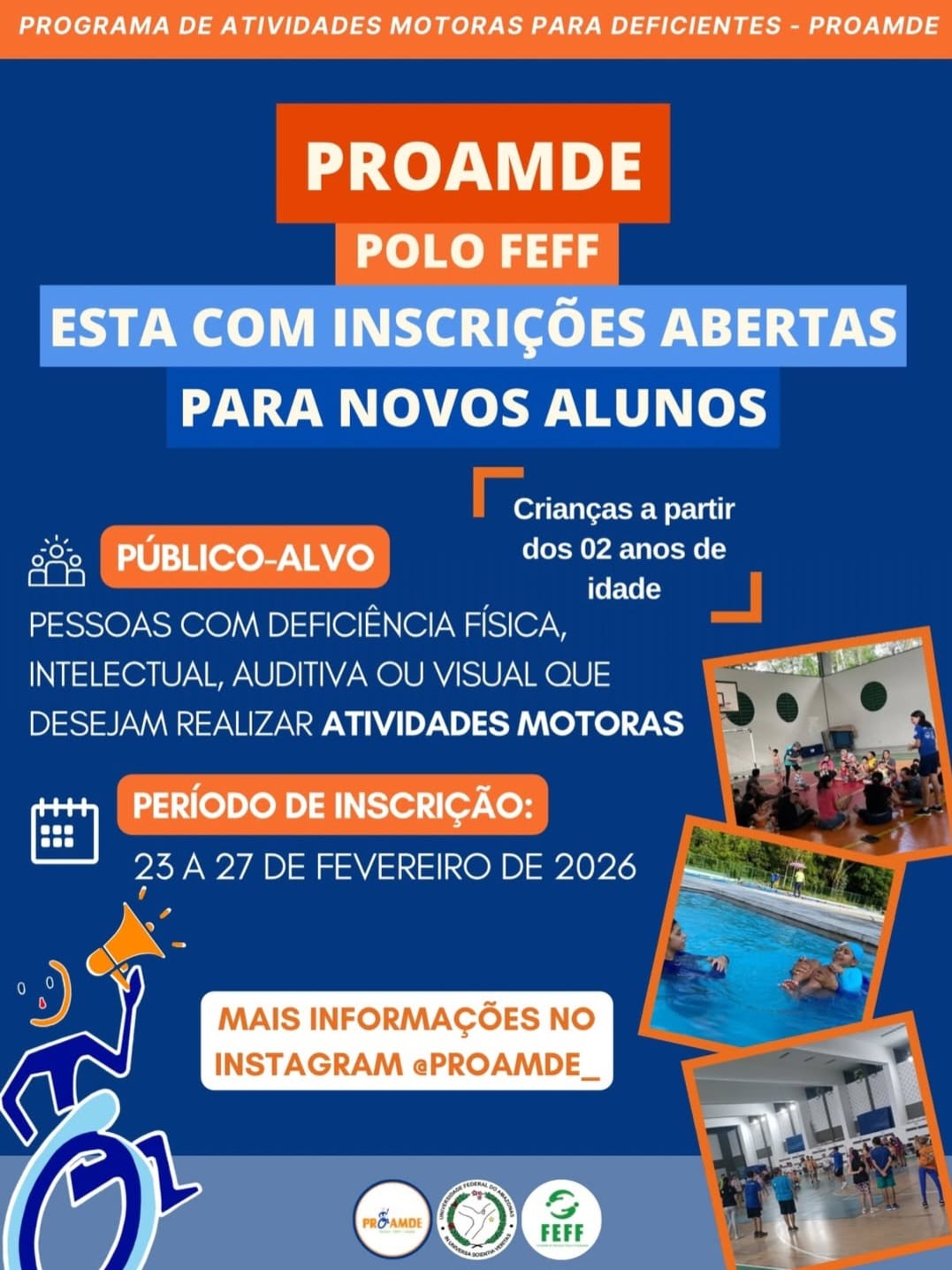 O Programa Atividades Motoras para Deficientes (Proamde) realiza inscrições de novos alunos para o Polo FEFF, em Manaus, no período de 23 a 27 de fevereiro, das 14h às 17h. As vagas são destinadas a pessoas com deficiência física, intelectual, auditiva ou visual, a partir dos dois anos de idade, que desejem realizar atividades motoras.