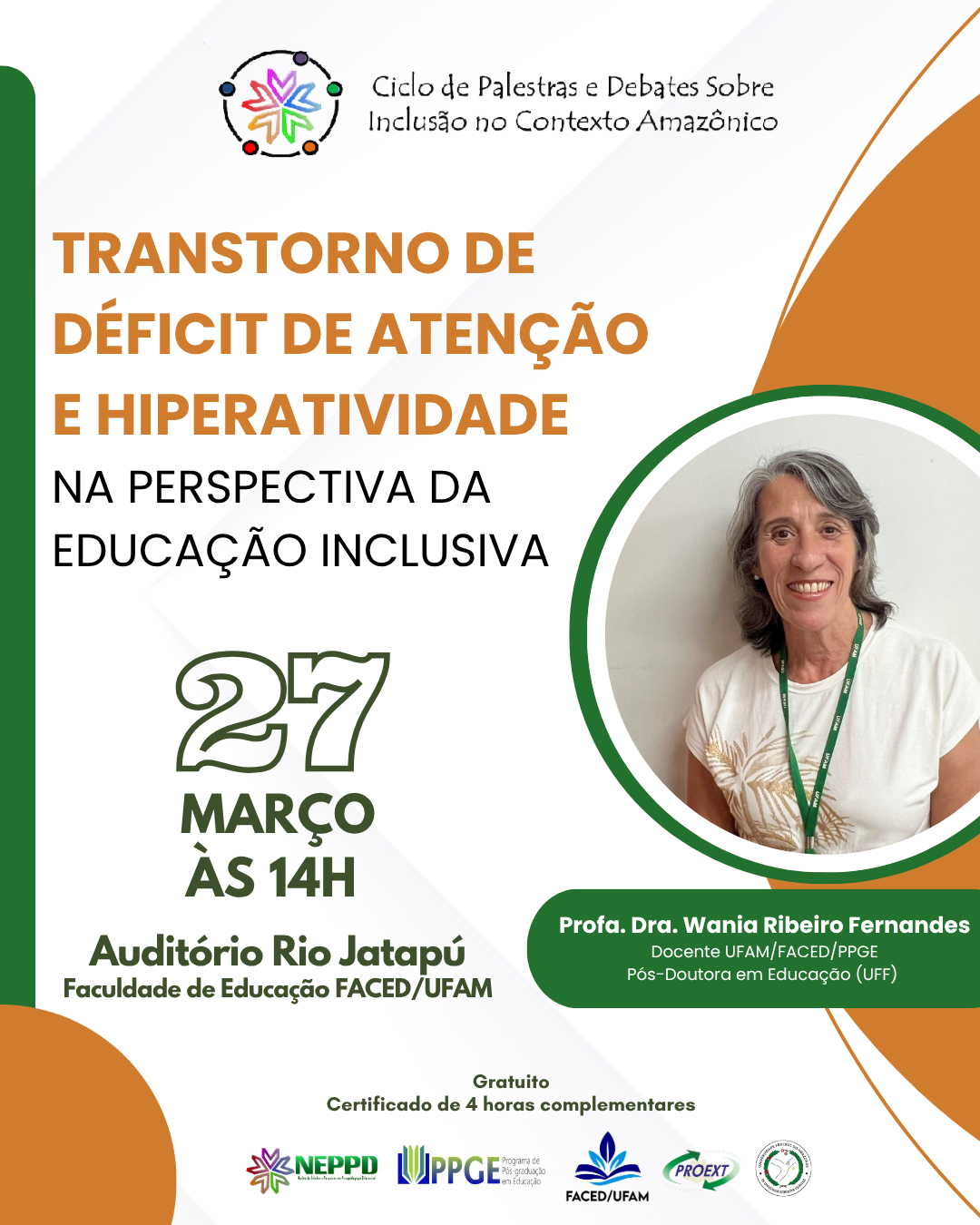 A palestra será proferida pela Professora Doutora Wania Ribeiro Fernandes: Pós-Doutorado em Educação, Psicóloga, Docente da Universidade Federal do Amazonas (UFAM) na Faculdade de Educação (FACED) e do Programa de Pós-Graduação em Educação (PPGE) e líder do NEPPD/UFAM.