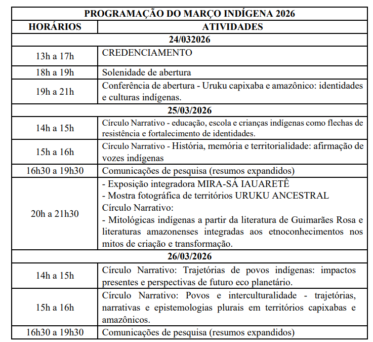O Seminário indígena Vermelho Urukú é uma ação integrada dos grupos de pesquisa Tupiabá (Universidade Federal do Espírito Santo) e Gremplexa (Universidade Federal do Amazonas), sob a coordenação dos professores doutores Marina Rodrigues Miranda (UFES) e Carlos Guedelha (PPGL/UFAM). O Seminário realiza-se em duas etapas: o circuito amazônico “Março indígena 2026”, no período de 24 a 27 de março de 2026, no campus da UFAM, em Manaus; e o circuito capixaba “Abril indígena 2026”, ressaltando a potência orgânica das culturas dos povos do Espírito Santo, das comunidades Aldeadas Guaranis e Tupiniquins e outros povos indígenas que habitam espaços urbanos