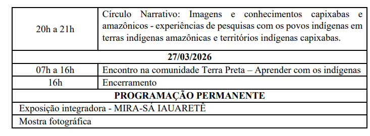 No último dia do evento, dia 27 de março, um grupo de pesquisadores, professores e estudantes participarão de uma visita à comunidade indígena Terra Preta, às margens do Rio Negro / AM, na RDS Puranga Conquista, que é uma unidade focada na valorização da cultura e identidade do povo Baré. Ali será desenvolvida a atividade “Aprender com os indígenas”. Serão momentos de escuta e aprendizado sobre os saberes ancestrais dos povos originários.