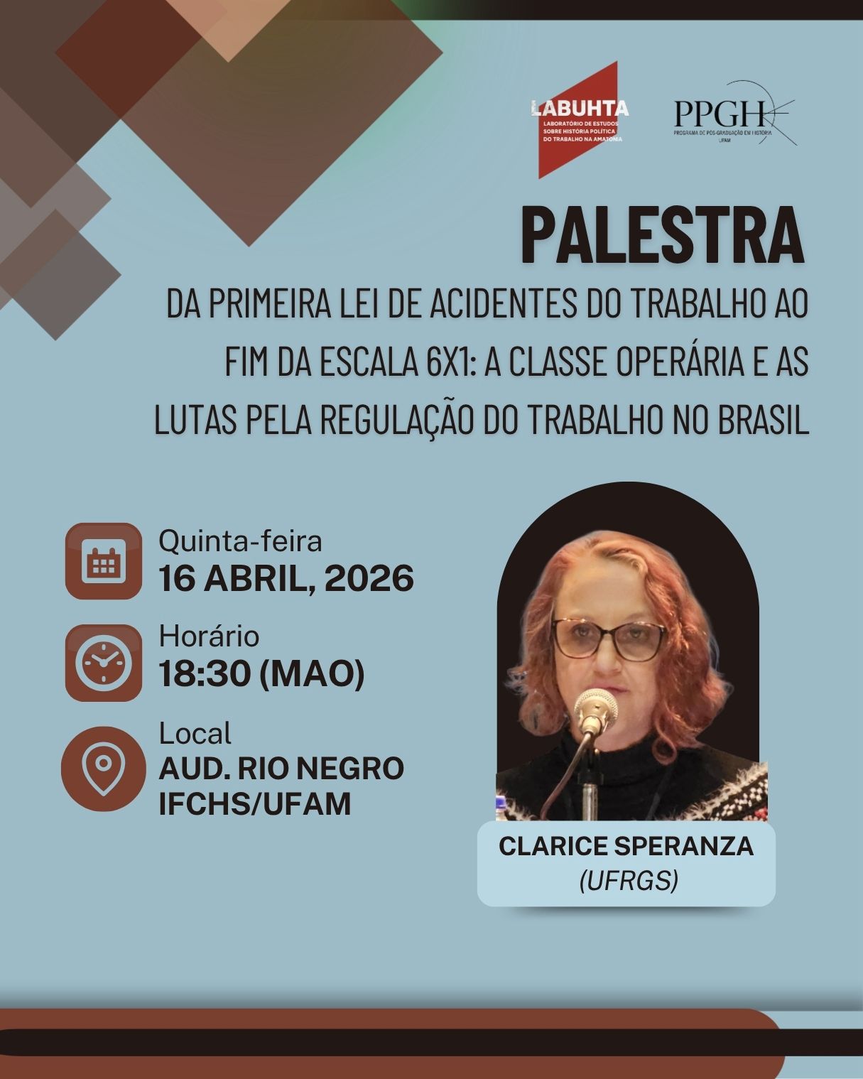 O Programa de Pós-Graduação em História da Universidade Federal do Amazonas (PPGH/UFAM) e o Laboratório de Estudos sobre História Política e do Trabalho na Amazônia (LABUHTA) convidam para a palestra: